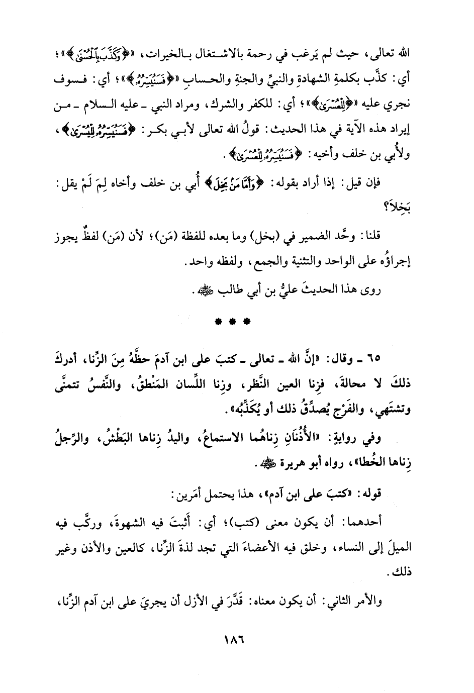 65 - وقال: "إنَّ الله - تعالى - كتبَ على ابن آدمَ حظَّهُ مِنَ الزِّنا، أدركَ ذلكَ لا محالةَ، فزِنا العين النَّظر، وزِنا اللِّسان المَنْطقُ، والنَّفسُ تتمنَّى وتشتَهي، والفَرْج يُصدِّقُ ذلك أو يُكَذِّبُه".