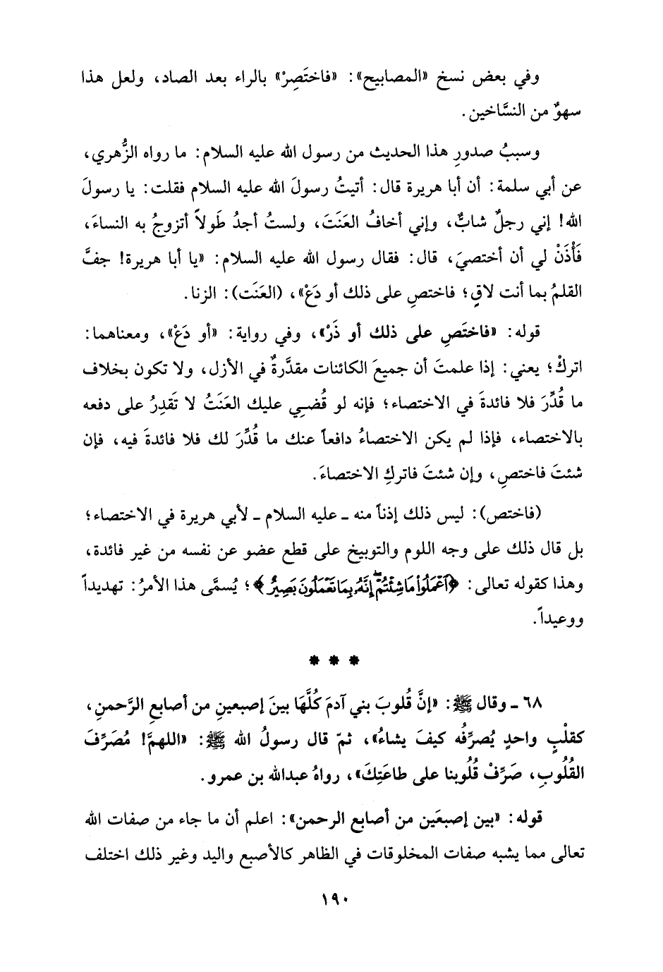 68 - وقال - صلى الله عليه وسلم -: "إنَّ قُلوبَ بني آدمَ كلَّهَا بينَ إصبعينِ من أصابعِ الرَّحمنِ، كقلْبٍ واحدٍ يُصرِّفُه كيفَ يشاءُ"، ثمّ قال رسولُ الله - صلى الله عليه وسلم -: "اللهمَّ! مُصَرِّفَ القُلُوبِ، صَرِّفْ قُلُوبنا على طاعَتِكَ"، رواهُ عبد الله بن عمرو.