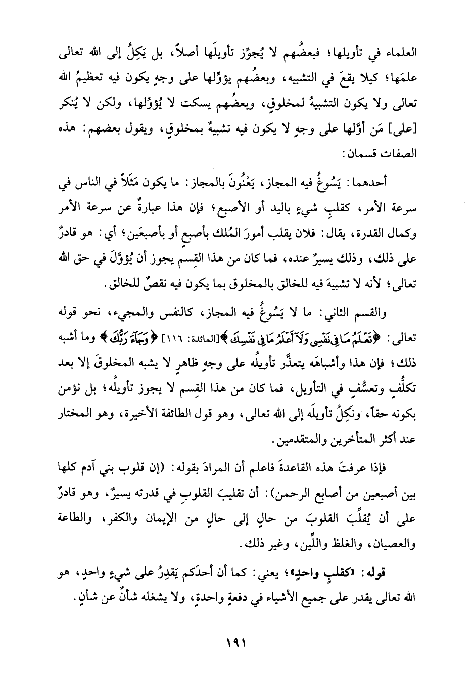 أحدهما: يَسُوغُ فيه المجاز، يَعْنُونَ بالمجاز: ما يكون مَثَلًا في الناس في سرعة الأمر، كقلبِ شيءٍ باليد أو الأصبع؛ فإن هذا عبارةٌ عن سرعة الأمر وكمال القدرة، يقال: فلان يقلب أمورَ المُلك بأصبعٍ أو بأصبعَين؛ أي: هو قادرٌ على ذلك، وذلك يسيرٌ عنده، فما كان من هذا القِسم يجوز أن يُؤوَّلَ في حق الله تعالى؛ لأنه لا تشبيهَ فيه للخالق بالمخلوق بما يكون فيه نقصٌ للخالق.