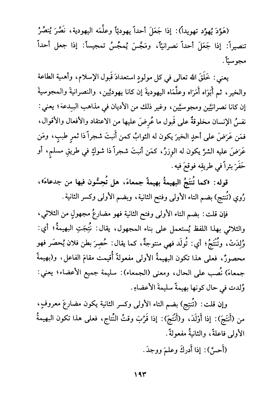 قوله: "كما تُنتَجُ البهيمةُ بهيمةً جمعاءَ، هل تُحِسُّون فيها من جدعاءَ"، رُوي (تُنتج) بضم التاء الأولى وفتح الثانية، وبضم الأولى وكسر الثانية.