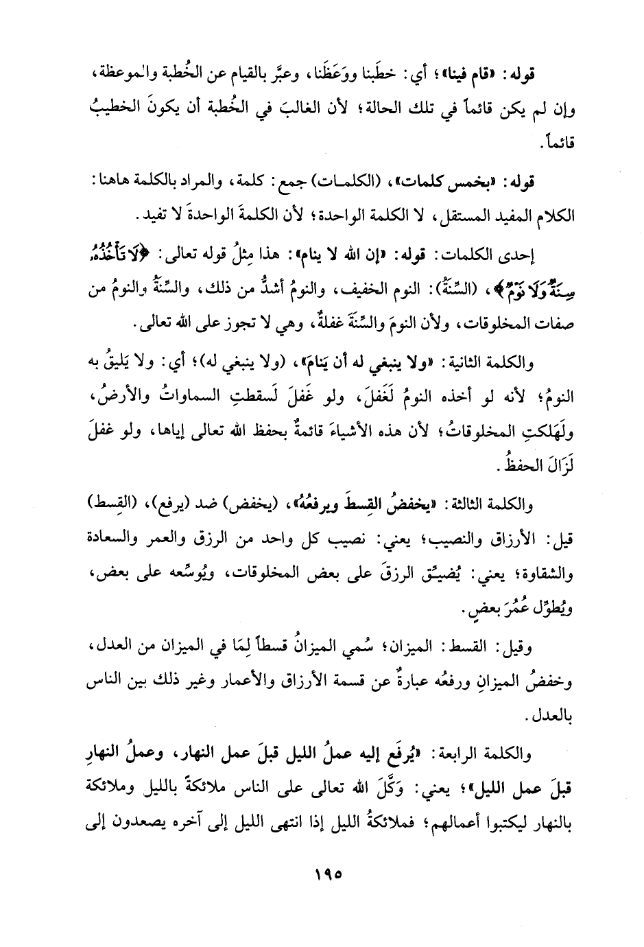 إحدى الكلمات: قوله: "إن الله لا ينام": هذا مِثلُ قوله تعالى: {لَا تَأْخُذُهُ سِنَةٌ وَلَا نَوْمٌ}، (السِّنَةُ): النوم الخفيف، والنومُ أشدُّ من ذلك، والسِّنَةُ والنومُ من صفات المخلوقات، ولأن النومَ والسِّنَةَ غفلةٌ، وهي لا تجوز على الله تعالى.