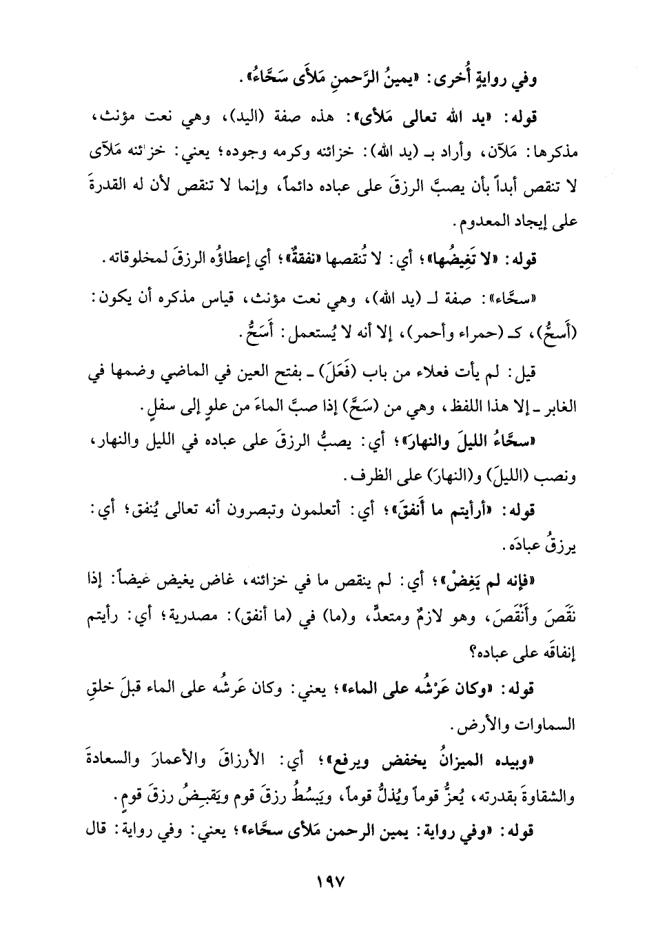 "سحَّاء": صفة لـ (يد الله)، وهي نعت مؤنث، قياس مذكره أن يكون: (أَسحُّ)، كـ (حمراء وأحمر)، إلا أنه لا يُستعمل: أَسَحُّ.