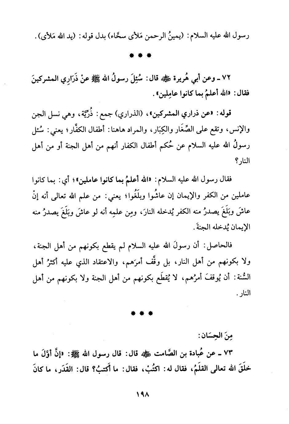 72 - وعن أبي هُريرة - رضي الله عنه - قال: سُئِلَ رسولُ الله - صلى الله عليه وسلم - عنْ ذَرَارِي المشركينَ فقال: "الله أعلمُ بما كانوا عامِلين".