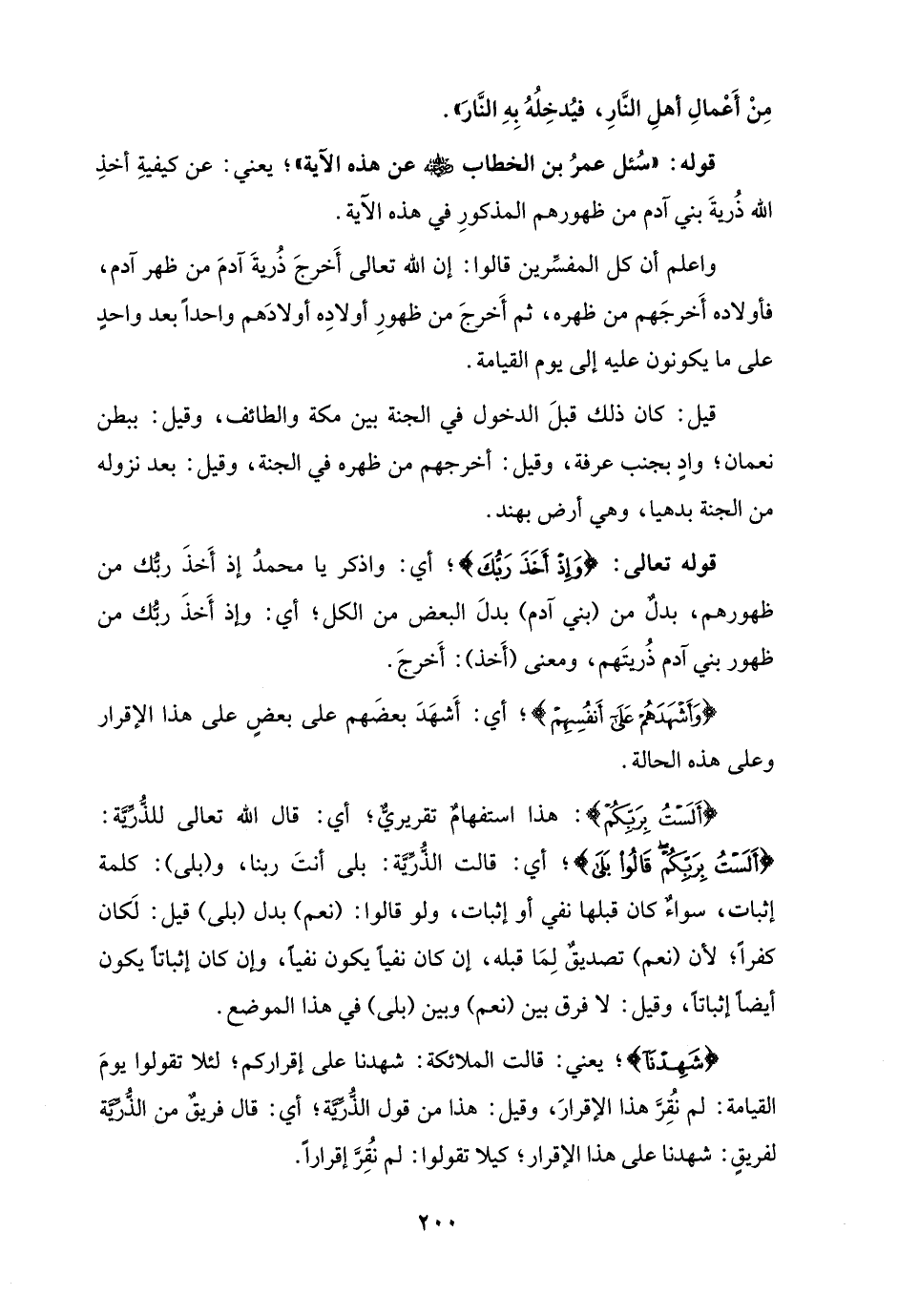واعلم أن كل المفسِّرين قالوا: إن الله تعالى أَخرجَ ذُريةَ آدم من ظهر آدم، فأولاده أَخرجَهم من ظهره، ثم أَخرجَ من ظهورِ أولادِه أولادَهم واحدًا بعد واحدٍ على ما يكونون عليه إلى يوم القيامة.