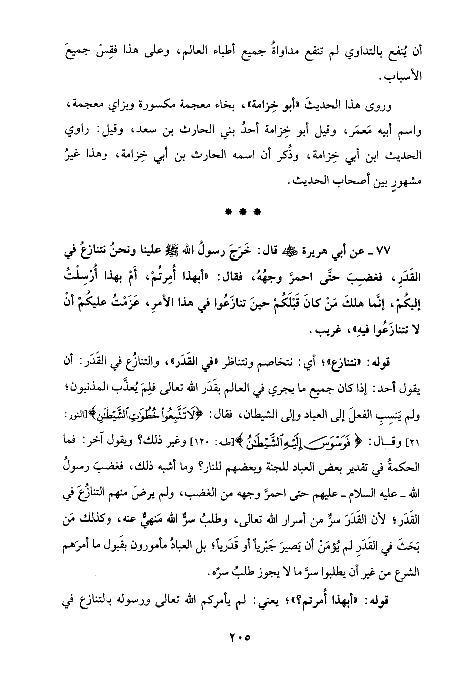77 - عن أبي هريرة - رضي الله عنه - قال: خَرَجَ رسولُ الله - صلى الله عليه وسلم - علينا ونحنُ نتنازعُ في القَدَرِ، فغضِبَ حتَّى احمرَّ وجهُهُ، فقال: "أبهذا أُمِرتُمْ، أَمْ بهذا أُرْسِلْتُ إليكُمْ، إنَّما هلكَ مَنْ كانَ قَبْلَكُمْ حينَ تنازَعُوا في هذا الأمرِ، عَزَمْتُ عليكُمْ أنْ لا تتنازَعُوا فيهِ"، غريب.