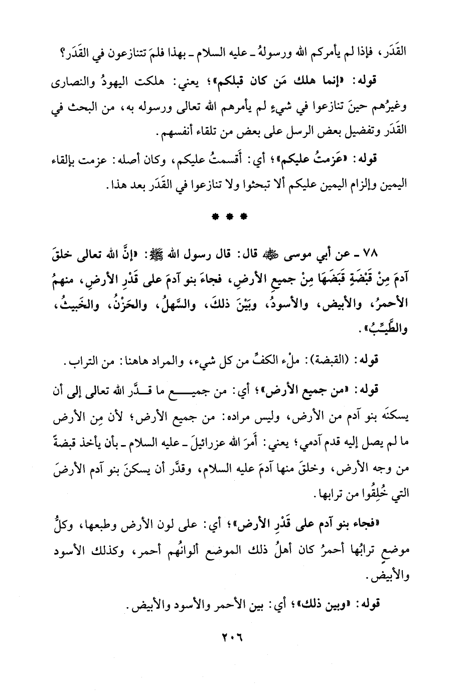 78 - عن أبي موسى - رضي الله عنه - قال: قال رسول الله - صلى الله عليه وسلم -: "إنَّ الله تعالى خلقَ آدمَ مِنْ قَبْضَةٍ قَبَضَهَا مِنْ جميعِ الأرضِ، فجاءَ بنو آدمَ على قَدْرِ الأرضِ، منهمُ الأحمرُ، والأبيض، والأسودُ، وبَيْنَ ذلكَ، والسَّهلُ، والحَزْنُ، والخَبيثُ، والطَّيِّبُ".