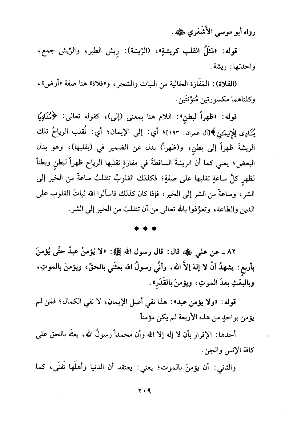 82 - عن علي - رضي الله عنه - قال: قال رسول الله - صلى الله عليه وسلم -: "لا يُؤمنُ عبدٌ حتَّى يُؤمنَ بأربعٍ: يشهدُ أنْ لا إلهَ إلاَّ الله، وأنِّي رسولُ الله بعثَني بالحقَّ، ويؤمنَ بالموتِ، وبالبعْثِ بعدَ الموتِ، ويؤمنَ بالقَدَرِ".