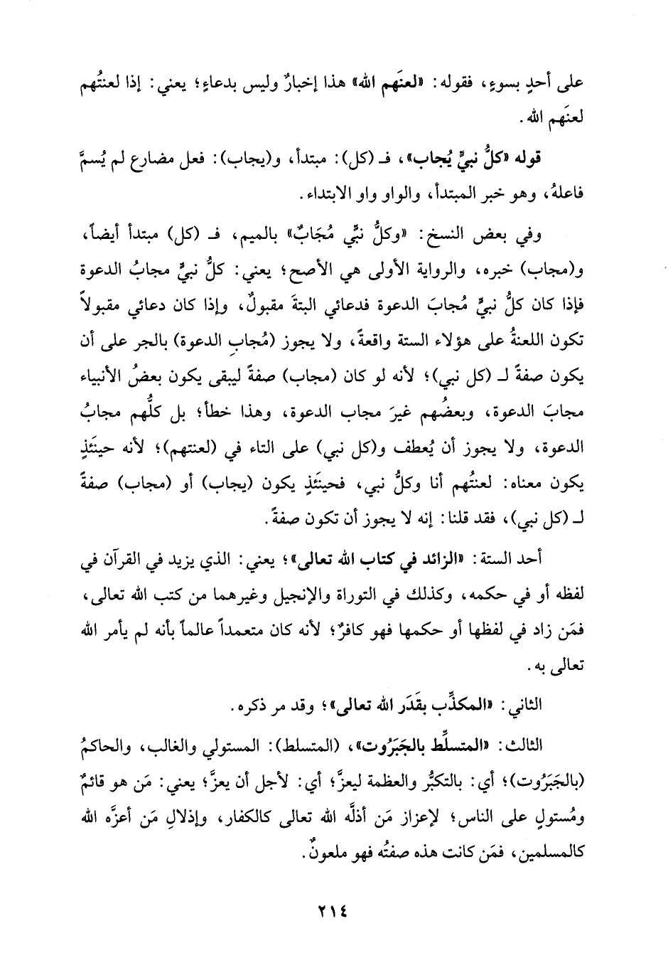 وفي بعض النسخ: "وكلُّ نبيًّ مُجَابٌ" بالميم، فـ (كل) مبتدأ أيضًا، و (مجاب) خبره، والرواية الأولى هي الأصح؛ يعني: كلُّ نبيًّ مجابُ الدعوة فإذا كان كلُّ نبيًّ مُجابَ الدعوة فدعائي البتةَ مقبولٌ، وإذا كان دعائي مقبولاً تكون اللعنةُ على هؤلاء الستة واقعةً، ولا يجوز (مُجابِ الدعوة) بالجر على أن يكون صفةً لـ (كل نبي)؛ لأنه لو كان (مجاب) صفةً ليبقى يكون بعضُ الأنبياء مجابَ الدعوة، وبعضُهم غيرَ مجاب الدعوة، وهذا خطأ؛ بل كلُّهم مجابُ الدعوة، ولا يجوز أن يُعطف و (كل نبي) على التاء في (لعنتهم)؛ لأنه حينَئذٍ يكون معناه: لعنتُهم أنا وكلُّ نبي، فحينَئذٍ يكون (يجاب) أو (مجاب) صفةً لـ (كل نبي)، فقد قلنا: إنه لا يجوز أن تكون صفةً.