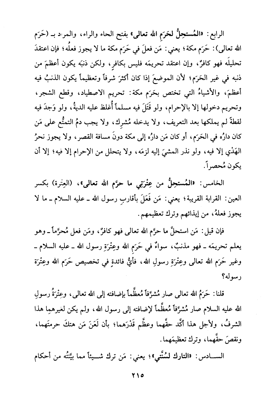 الرابع: "المُستحِلُّ لحَرَمِ الله تعالى" بفتح الحاء والراء، والمراد بـ (حَرَم الله تعالى): حَرَم مكة؛ يعني: مَن فعلَ في حَرَم مكة ما لا يجوز فعلُه؛ فإن اعتقدَ تحليلَه فهو كافرٌ، وإن اعتقد تحريمَه فليس بكافرٍ، ولكن ذنبَه يكون أعظمَ من ذنبه في غير الحَرَم؛ لأن الموضعَ إذا كان أكثرَ شرفًا وتعظيمًا يكون الذنبُ فيه أعظمَ، والأشياءُ التي تختص بحَرَم مكة: تحريم الاصطياد، وقطع الشجر، وتحريم دخولها إلا بالإحرام، ولو قَتَلَ فيه مسلمًا أُغلظ عليه الديةُ، ولو وَجدَ فيه لقطةً لم يملكها بعد التعريف، ولا يدخله مُشرِك، ولا يجب دمُ التمتُّع على مَن كان دارُه في الحَرَم، أو كان مَن دارُه إلى مكة دونَ مسافة القصر، ولا يجوز نحرُ الهَدْي إلا فيه، ولو نذر المشيَ إليه لزمَه، ولا يتحلل من الإحرام إلا فيه؛ إلا أن يكون مُحصرًا.