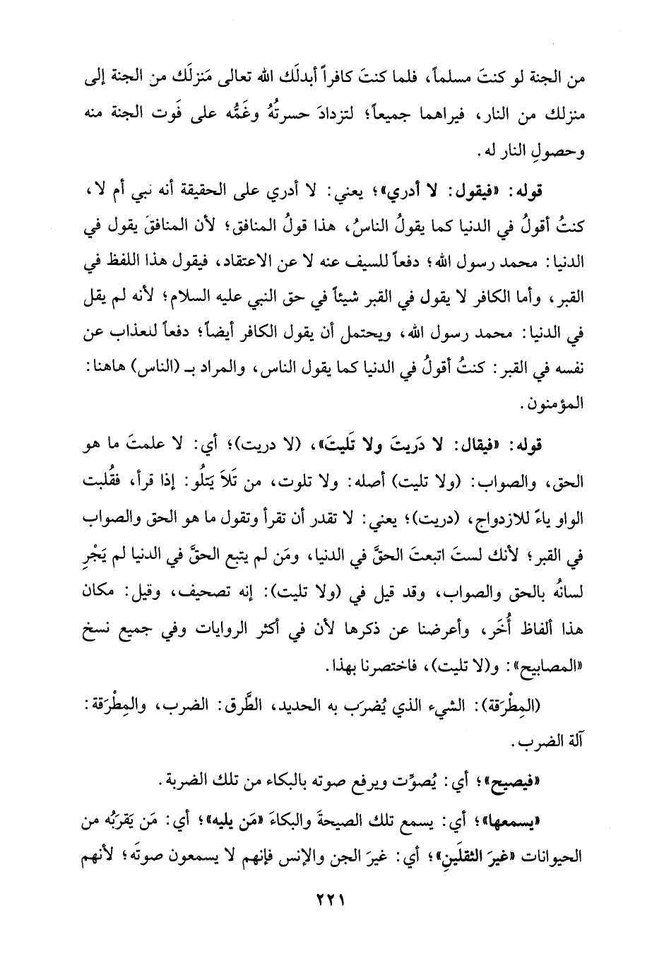 قوله: "فيقال: لا دَريتَ ولا تَليتَ"، (لا دريت)؛ أي: لا علمتَ ما هو الحق، والصواب: (ولا تليت) أصله: ولا تلوت، من تَلاَ يَتلُو: إذا قرأ، فقُلبت الواو ياءً للازدواج، (دريت)؛ يعني: لا تقدر أن تقرأ وتقول ما هو الحق والصواب في القبر؛ لأنك لستَ اتبعتَ الحقَّ في الدنيا، ومَن لم يتبع الحقَّ في الدنيا لم يَجْرِ لسانُه بالحق والصواب، وقد قيل في (ولا تليت): إنه تصحيف، وقيل: مكان هذا ألفاظ أُخَر، وأعرضنا عن ذكرها لأن في أكثر الروايات وفي جميع نسخ "المصابيح": و (لا تليت)، فاختصرنا بهذا.