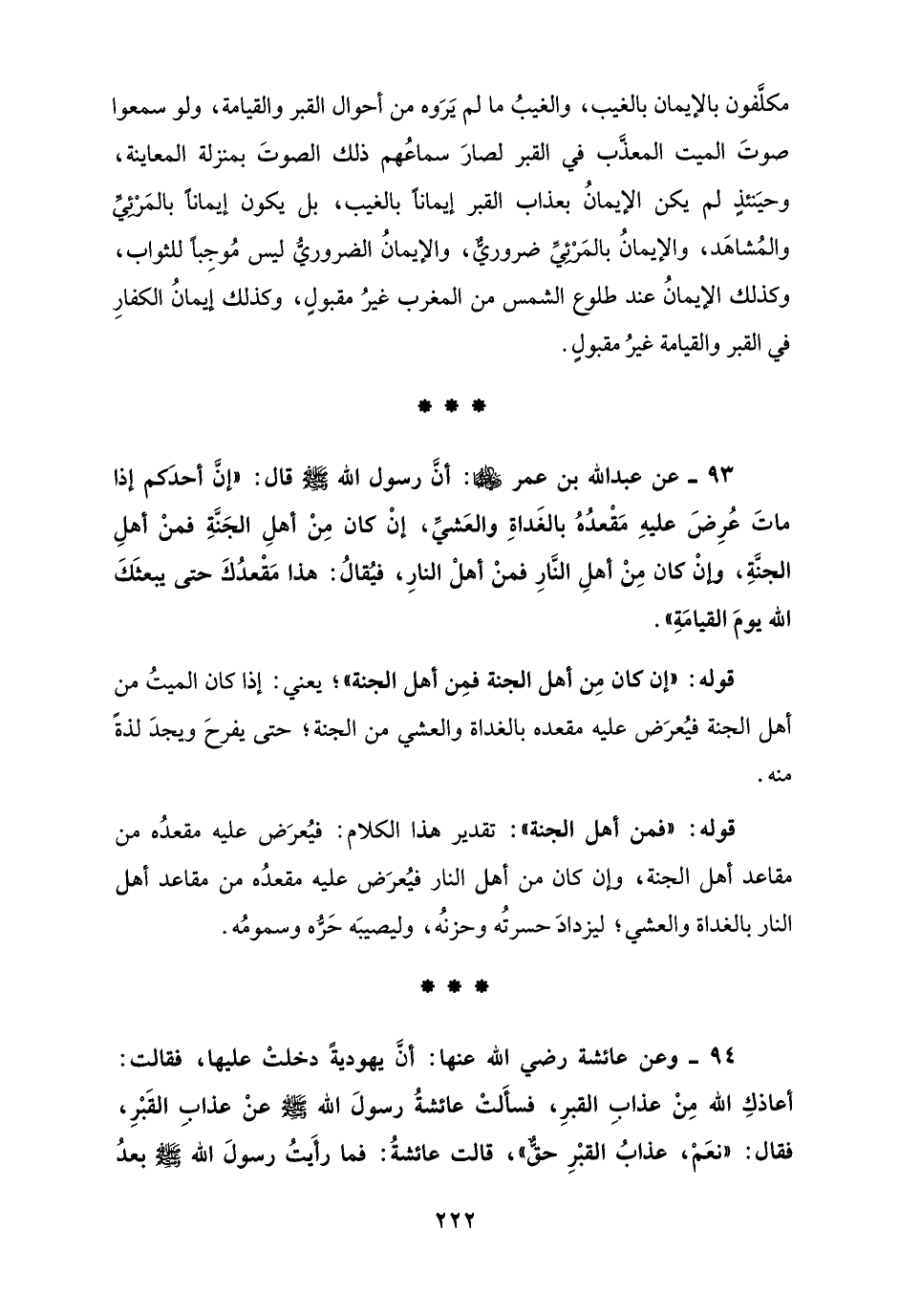 94 - وعن عائشة رضي الله عنها: أنَّ يهوديةً دخلتْ عليها، فقالت: أعاذكِ الله مِنْ عذابِ القبرِ، فسأَلتْ عائشةُ رسولَ الله - صلى الله عليه وسلم - عنْ عذابِ القَبْرِ، فقال: "نعَمْ، عذابُ القبْرِ حقٌّ"، قالت عائشةُ: فما رأَيتُ رسولَ الله - صلى الله عليه وسلم - بعدُ