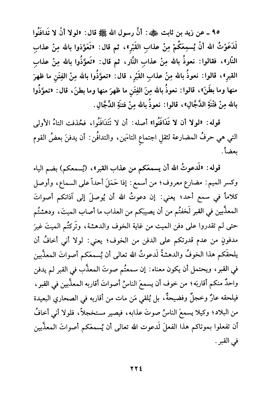 95 - عن زيد بن ثابت - رضي الله عنه -: أنَّ رسول الله - صلى الله عليه وسلم - قال: "لولا أنْ لا تَدافَنُوا لَدَعَوْتُ الله أنْ يُسمِعَكُمْ مِنْ عذابِ القَبْرِ"، ثم قال: "تَعَوَّذوا بالله مِنْ عذابِ النّار"، فقالوا: نعوذُ بالله مِنْ عذابِ النَّار، ثم قال: "تَعوَّذُوا بالله مِنْ عذابِ القبرِ"، قالوا: نعوذُ بالله مِنْ عذابِ القَبْرِ، قال: "تعوَّذُوا بالله مِنْ الفِتَنِ ما ظهرَ منها وما بطَنَ"، قالوا: نعوذُ بالله مِنَ الفِتَنِ ما ظهرَ منها وما بطنَ، قال: "تعوَّذُوا بالله مِنْ فتْنَةِ الدَّجَّالِ"، قالوا: نعوذُ بالله مِنْ فتنَةِ الدَّجالِ.
