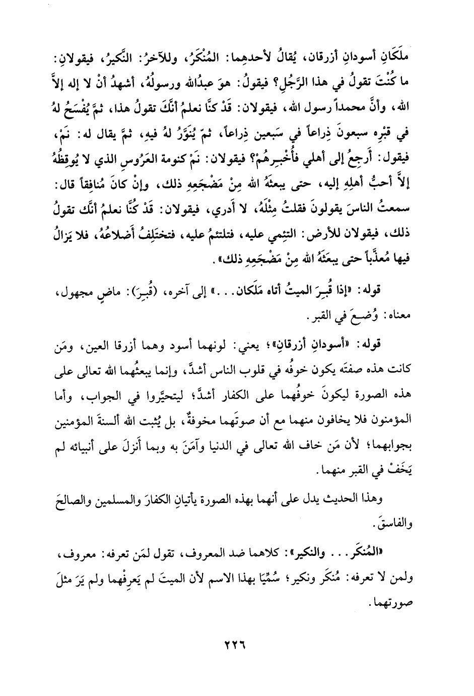 ملَكَانِ أسودانِ أزرقان، يُقالُ لأحدهِما: المُنْكَرُ، وللآخرُ: النَّكيرُ، فيقولانِ: ما كُنْتَ تقولُ في هذا الرَّجُلِ؟ فيقولُ: هوَ عبدُ الله ورسولُهُ، أشهدُ أنْ لا إله إلاَّ الله، وأنَّ محمدًا رسول الله، فيقولان: قَدْ كنَّا نعلمُ أنَّكَ تقولُ هذا، ثمَّ يُفْسَحُ لهُ في قبْرِه سبعونَ ذِراعًا في سَبعين ذِراعًا، ثمّ يُنَوَّرُ لهُ فيهِ، ثمَّ يقال له: نَمْ، فيقول: أَرجِعُ إلى أهلي فأُخْبِرهُمْ؟ فيقولان: نَمْ كنومة العَرُوسِ الذي لا يُوقِظُهُ إلاَّ أحبُّ أهلِهِ إليه، حتى يبعثَهُ الله مِنْ مَضْجَعِهِ ذلك، وإنْ كانَ مُنافِقًا قال: سمعتُ الناسَ يقولونَ فقلتُ مِثْلَهُ، لا أَدري، فيقولان: قَدْ كُنَّا نعلمُ أنَّك تقولُ ذلك، فيقولان للأرض: التئِمي عليه، فتلتئمُ عليه، فتختَلِفُ أَضلاعُهُ، فلا يَزالُ فيها مُعذَّبًا حتى يبعَثَهُ الله مِنْ مَضْجَعِهِ ذلك".