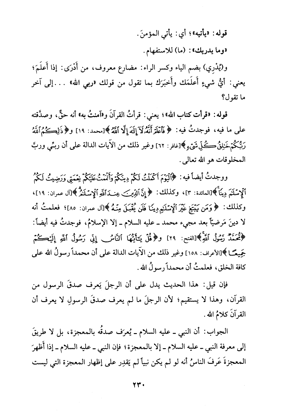 ووجدتُ أيضًا فيه: {الْيَوْمَ أَكْمَلْتُ لَكُمْ دِينَكُمْ وَأَتْمَمْتُ عَلَيْكُمْ نِعْمَتِي وَرَضِيتُ لَكُمُ الْإِسْلَامَ دِينًا} [المائدة: 3]، وكذلك: {إِنَّ الدِّينَ عِنْدَ اللَّهِ الْإِسْلَامُ} [آل عمران: 19]، وكذلك: {وَمَنْ يَبْتَغِ غَيْرَ الْإِسْلَامِ دِينًا فَلَنْ يُقْبَلَ مِنْهُ} [آل عمران: 85]؛ فعلمتُ أنه لا دينَ مَرضيًّا بعد مجيء محمد - عليه السلام - إلا الإسلامُ، فوجدتُ فيه أيضًا: {مُحَمَّدٌ رَسُولُ اللَّهِ} [الفتح: 29] و {قُلْ يَاأَيُّهَا النَّاسُ إِنِّي رَسُولُ اللَّهِ إِلَيْكُمْ جَمِيعًا} [الأعراف: 158] وغير ذلك من الآيات الدالة على أن محمدًا رسولُ الله على كافة الخلق، فعلمتُ أن محمدًا رسولُ الله.