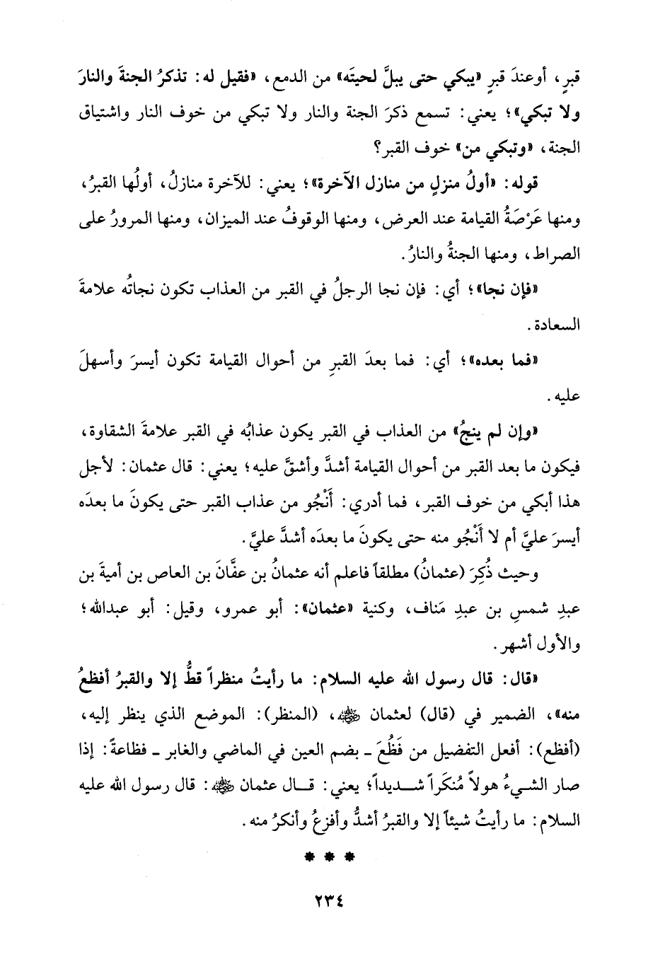 "قال: قال رسول الله عليه السلام: ما رأيتُ منظرًا قطُّ إلا والقبرُ أفظعُ منه"، الضمير في (قال) لعثمان - رضي الله عنه -، (المنظر): الموضع الذي ينظر إليه، (أفظع): أفعل التفضيل من فَظُعَ - بضم العين في الماضي والغابر - فظاعةً: إذا صار الشيءُ هولاً مُنكَرًا شديدًا؛ يعني: قال عثمان - رضي الله عنه -: قال رسول الله عليه السلام: ما رأيتُ شيئًا إلا والقبرُ أشدُّ وأفزعُ وأنكرُ منه.