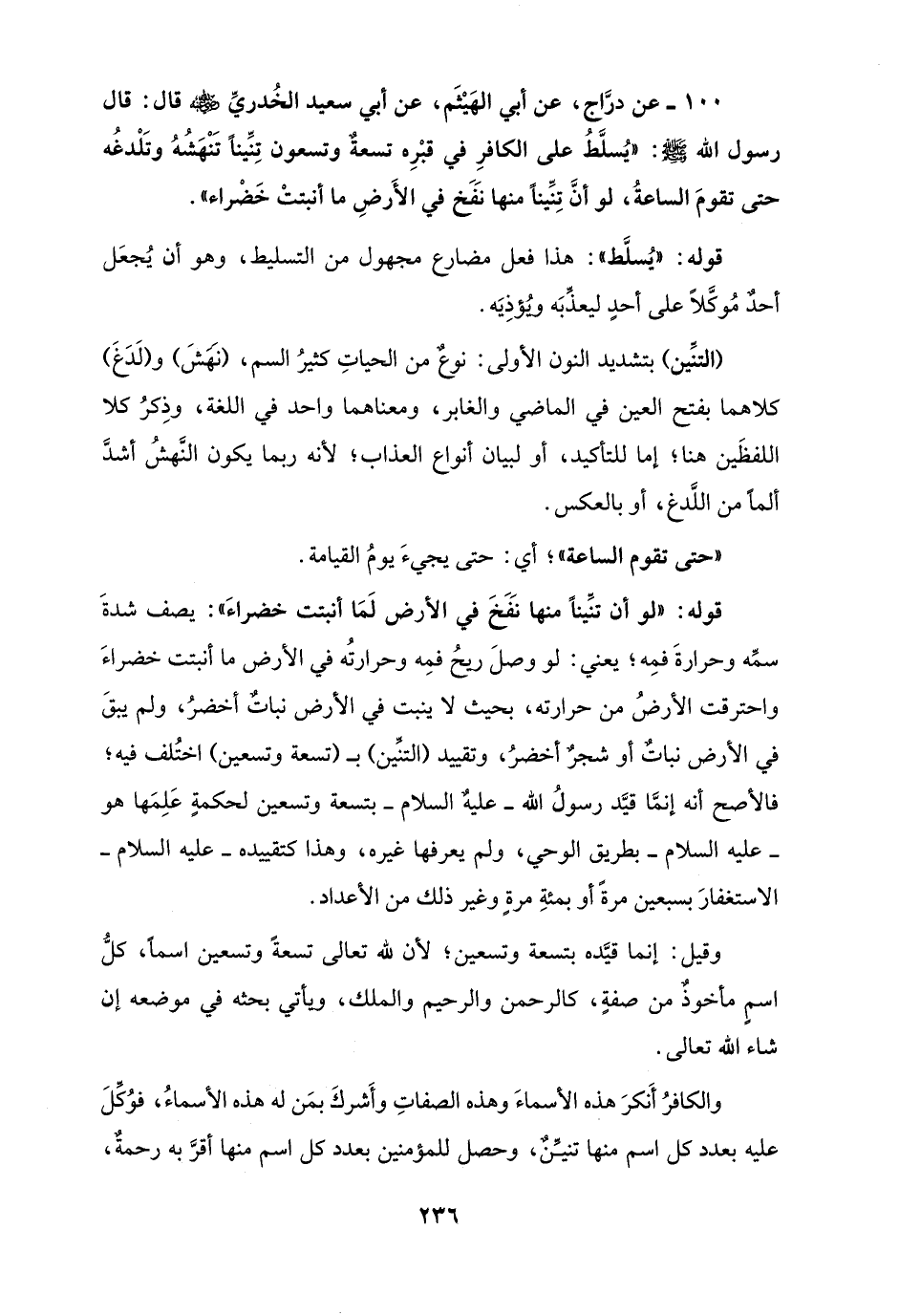 100 - عن درَّاج، عن أبي الهَيْثَم، عن أبي سعيد الخُدريِّ - رضي الله عنه - قال: قال رسول الله - صلى الله عليه وسلم -: "يُسلَّطُ على الكافرِ في قبْرِه تسعةٌ وتسعون تِنِّينًا تنْهَشُهُ وتَلْدغُه حتى تقومَ الساعةُ، لو أنَّ تِنِّينًا منها نَفَخ في الأَرضِ ما أنبتتْ خَضْراء".
