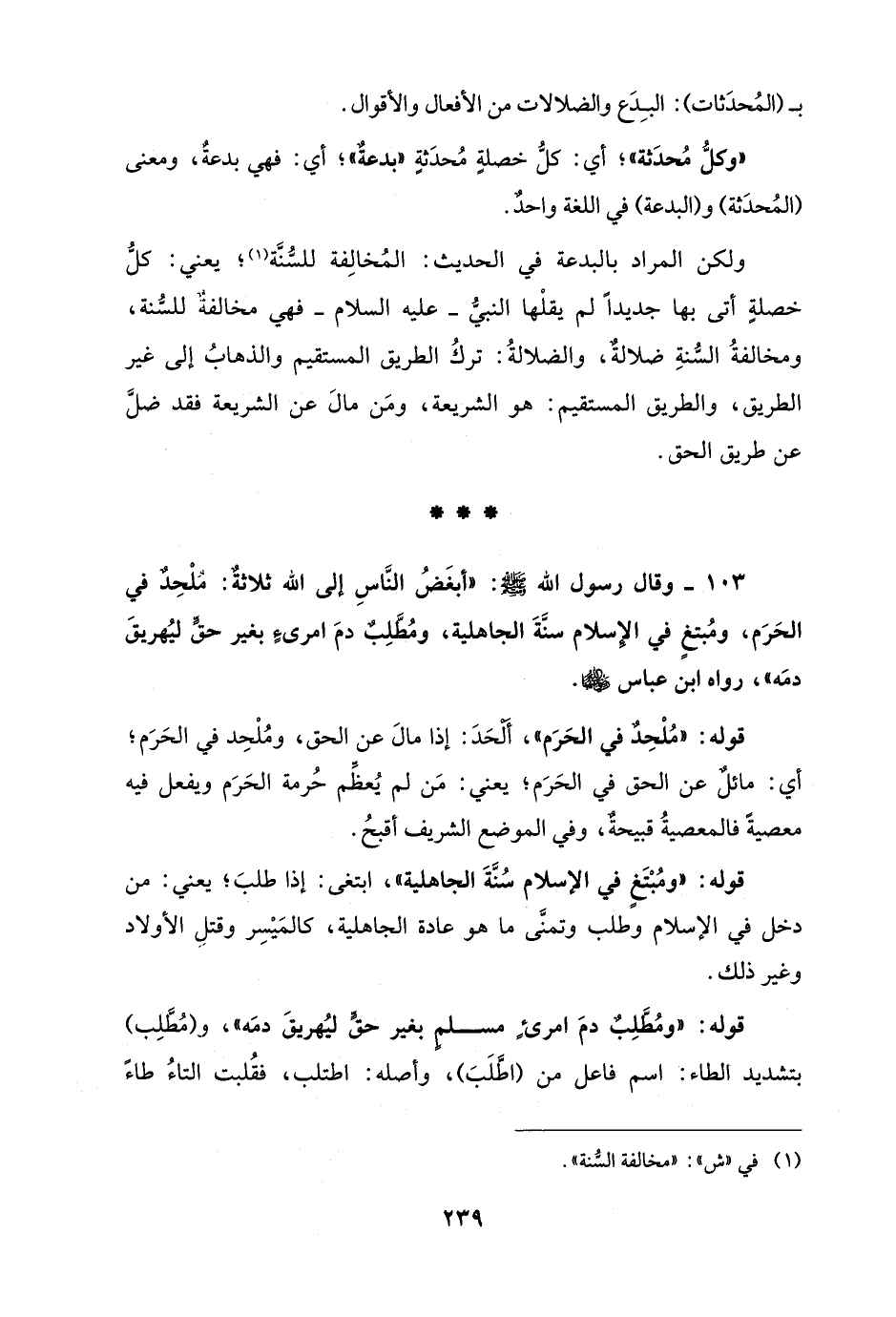 103 - وقال رسول الله - صلى الله عليه وسلم -: "أبغَضُ النَّاسِ إلى الله ثلاثةٌ: مُلْحِدٌ في الحَرَم، ومُبتغٍ في الإسلام سنَّةَ الجاهلية، ومُطَّلِبٌ دمَ امرئٍ بغير حقًّ ليُهريقَ دمَه"، رواه ابن عباس - رضي الله عنهما -.