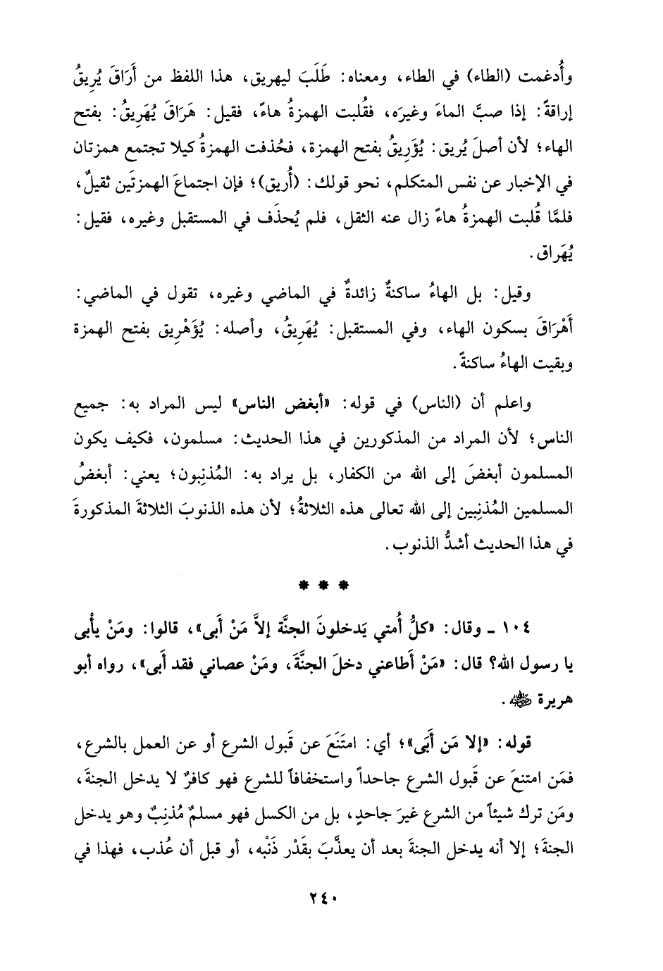 104 - وقال: "كلُّ أُمتي يَدخلونَ الجنَّة إلاَّ مَنْ أَبى"، قالوا: ومَنْ يأْبى يا رسول الله؟ قال: "مَنْ أَطاعني دخلَ الجنَّةَ، ومَنْ عصاني فقد أَبى"، رواه أبو هريرة - رضي الله عنه -.