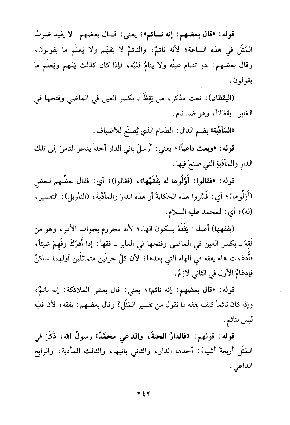 قوله: "قال بعضهم: إنه نائم"؛ يعني: قال بعض الملائكة: إنه نائمٌ، وإذا كان نائمًا كيف يفقه ما نقول من تفسير المَثَل؟ وقال بعضهم: يفقه؛ لأن قلبَه ليس بنائمٍ.
