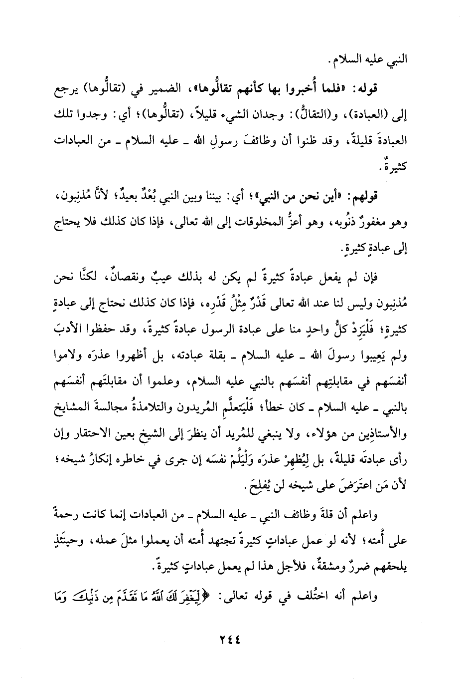 فإن لم يفعل عبادةً كثيرةً لم يكن له بذلك عيبٌ ونقصانٌ، لكنَا نحن مُذنِبون وليس لنا عند الله تعالى قَدْرٌ مِثْل قَدْرِه، فإذا كان كذلك نحتاج إلى عبادةٍ كثيرةٍ؛ فَلْيَزِدْ كلُّ واحدٍ منا على عبادة الرسول عبادةً كثيرةً، وقد حفظوا الأدبَ ولم يَعِيبوا رسولَ الله - عليه السلام - بقلة عبادته، بل أظهروا عذرَه ولاموا أنفسَهم في مقابلتِهم أنفسَهم بالنبي عليه السلام، وعلموا أن مقابلتَهم أنفسَهم بالنبي - عليه السلام - كان خطأ؛ فَلْيتعلَّمِ المُريدون والتلامذةُ مجالسةَ المشايخ والأستاذِين من هؤلاء، ولا ينبغي للمُريد أن ينظرَ إلى الشيخ بعين الاحتقار وإن رأى عبادتَه قليلةً، بل لِيُظهِرْ عذرَه وَلْيَلمْ نفسَه إن جرى في خاطره إنكارُ شيخه؛ لأن مَن اعتَرَضَ على شيخه لن يُفلِحَ.