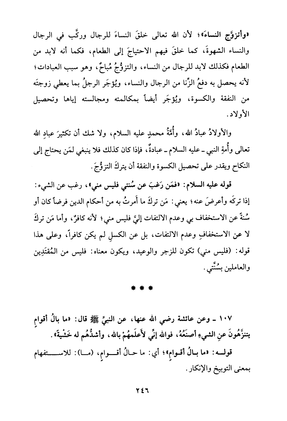 107 - وعن عائشة رضي الله عنها، عن النبيِّ - صلى الله عليه وسلم - قال: "ما بالُ أقوامٍ يتنزَّهُونَ عنِ الشيءِ أصنَعُهُ، فوالله إنَّي لأَعلَمهُمْ بالله، وأشدُّهُم له خَشْيةً".