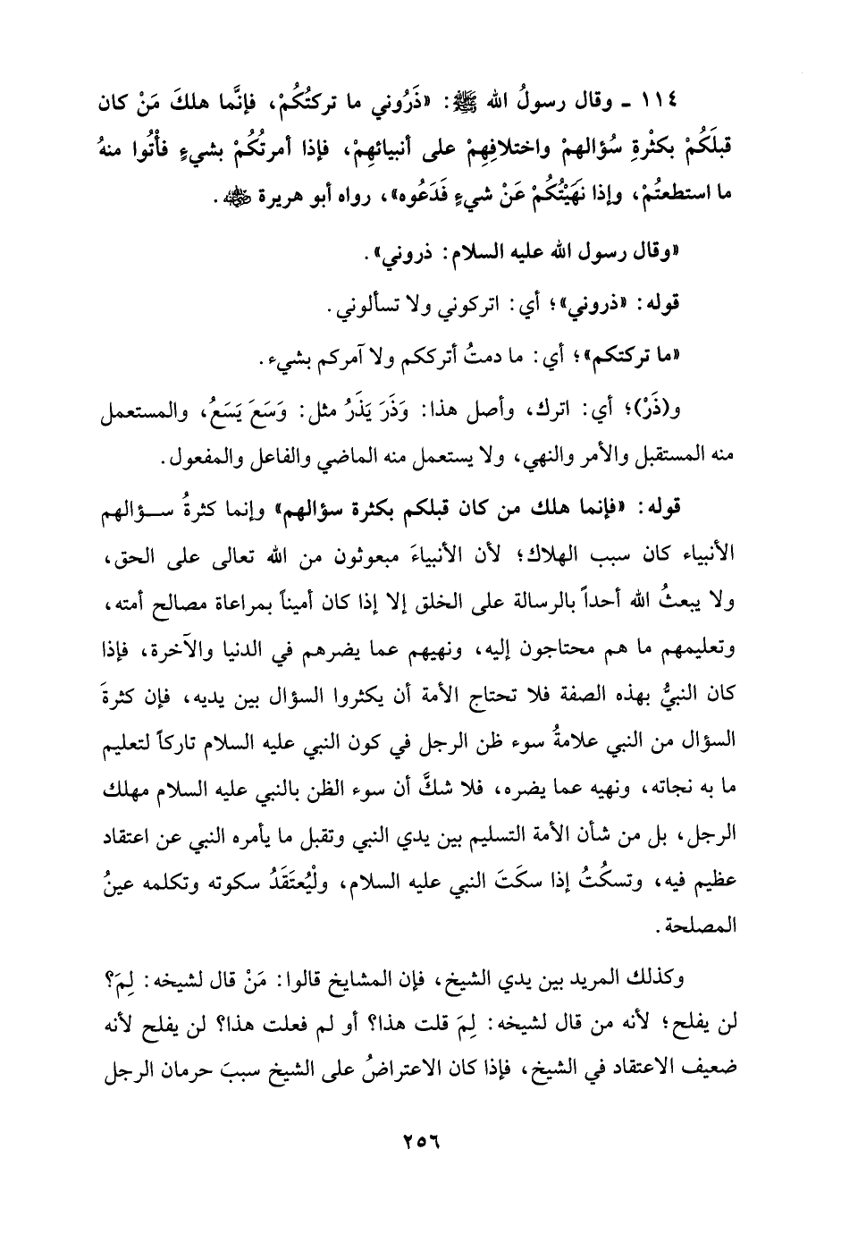 114 - وقال رسولُ الله - صلى الله عليه وسلم -: "ذَرُوني ما تركتُكُمْ، فإنَّما هلكَ مَنْ كان قبلَكُمْ بكثْرةِ سُؤالهمْ واختلافِهِمْ على أنبيائهِمْ، فإذا أمرتُكُمْ بشيءٍ فأْتُوا منهُ ما استطعتُمْ، وإذا نَهَيْتُكُمْ عَنْ شيءٍ فَدَعُوه"، رواه أبو هريرة - رضي الله عنه -.