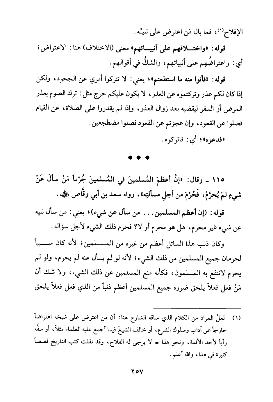 115 - وقال: "إنَّ أعظمَ المُسلمينَ في المُسلمينَ جُرْمًا مَنْ سألَ عَنْ شيءٍ لمْ يُحرَّمْ، فَحُرِّمَ من أجلِ مسألتِه"، رواه سعد بن أبي وقَّاص - رضي الله عنه -.