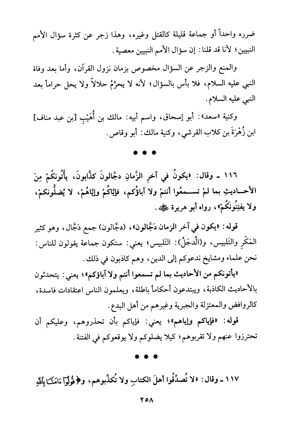 116 - وقال: "يكونُ في آخرِ الزَّمانِ دجَّالونَ كذَّابونَ، يأْتُونكُمْ مِنَ الأحاديثِ بما لمْ تسمعُوا أنتمْ ولا آباؤُكم، فإيَّاكُمْ وإيَّاهُمْ، لا يُضلُّونكمْ، ولا يفتِنُونَكُمْ"، رواه أبو هريرة - رضي الله عنه -.