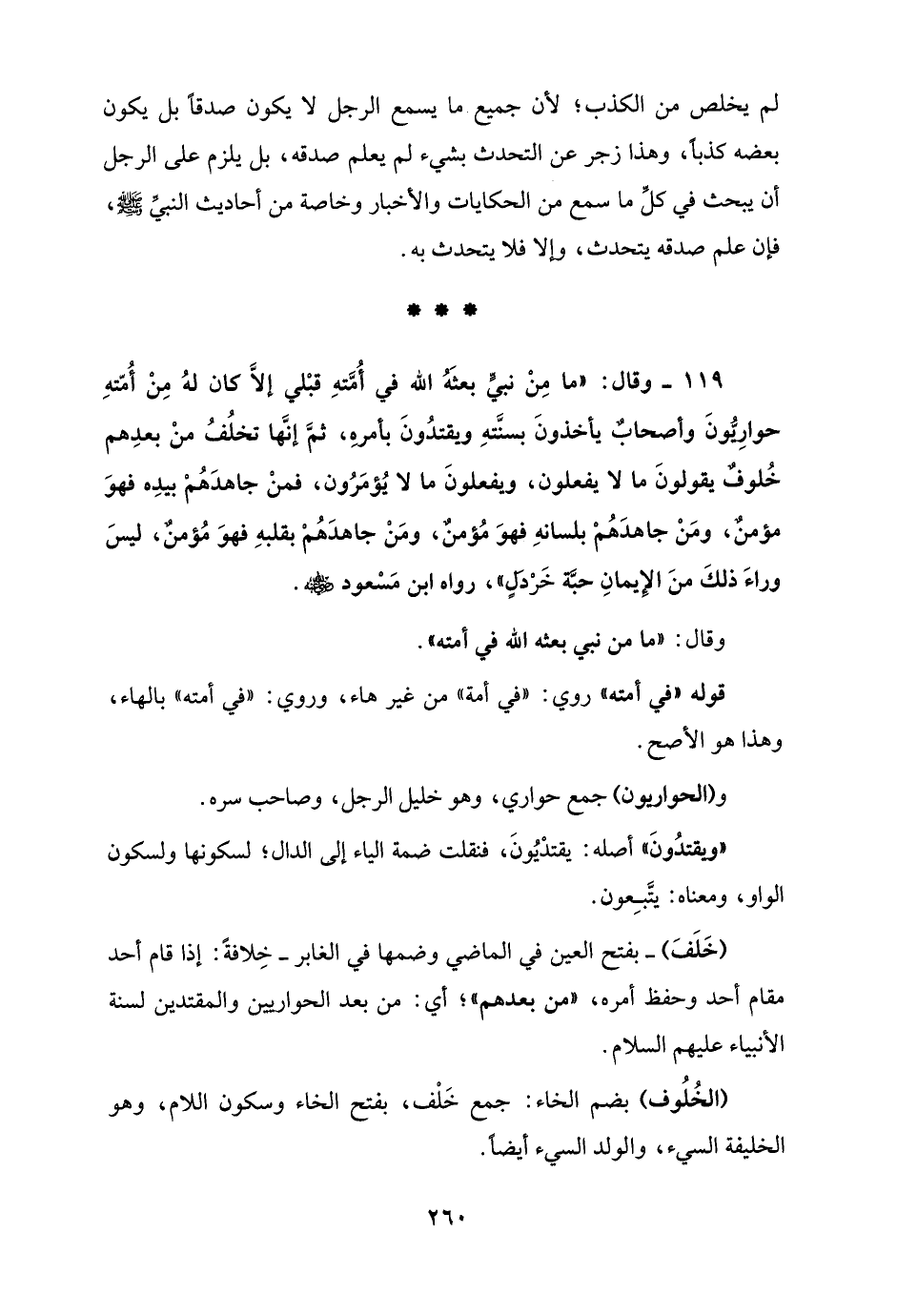 119 - وقال: "ما مِن نبيٍّ بعثَهُ الله في أُمَّتهِ قبْلي إلاَّ كان لهُ مِن أُمّتهِ حوارِيُّونَ وأصحابٌ يأخذونَ بسنَّتهِ ويقتدُونَ بأمرهِ، ثمَّ إنَّها تخلُفُ منْ بعدِهم خُلوفٌ يقولونَ ما لا يفعلون، ويفعلونَ ما لا يُؤمَرُون، فمنْ جاهدَهُمْ بيدِه فهوَ مؤمنٌ، ومَنْ جاهدَهُمْ بلسانهِ فهوَ مُؤمنٌ، ومَنْ جاهدَهُمْ بقلبهِ فهوَ مُؤمنٌ، ليسَ وراءَ ذلكَ منَ الإِيمانِ حبَّة خَرْدَلٍ"، رواه ابن مَسْعود - رضي الله عنه -.