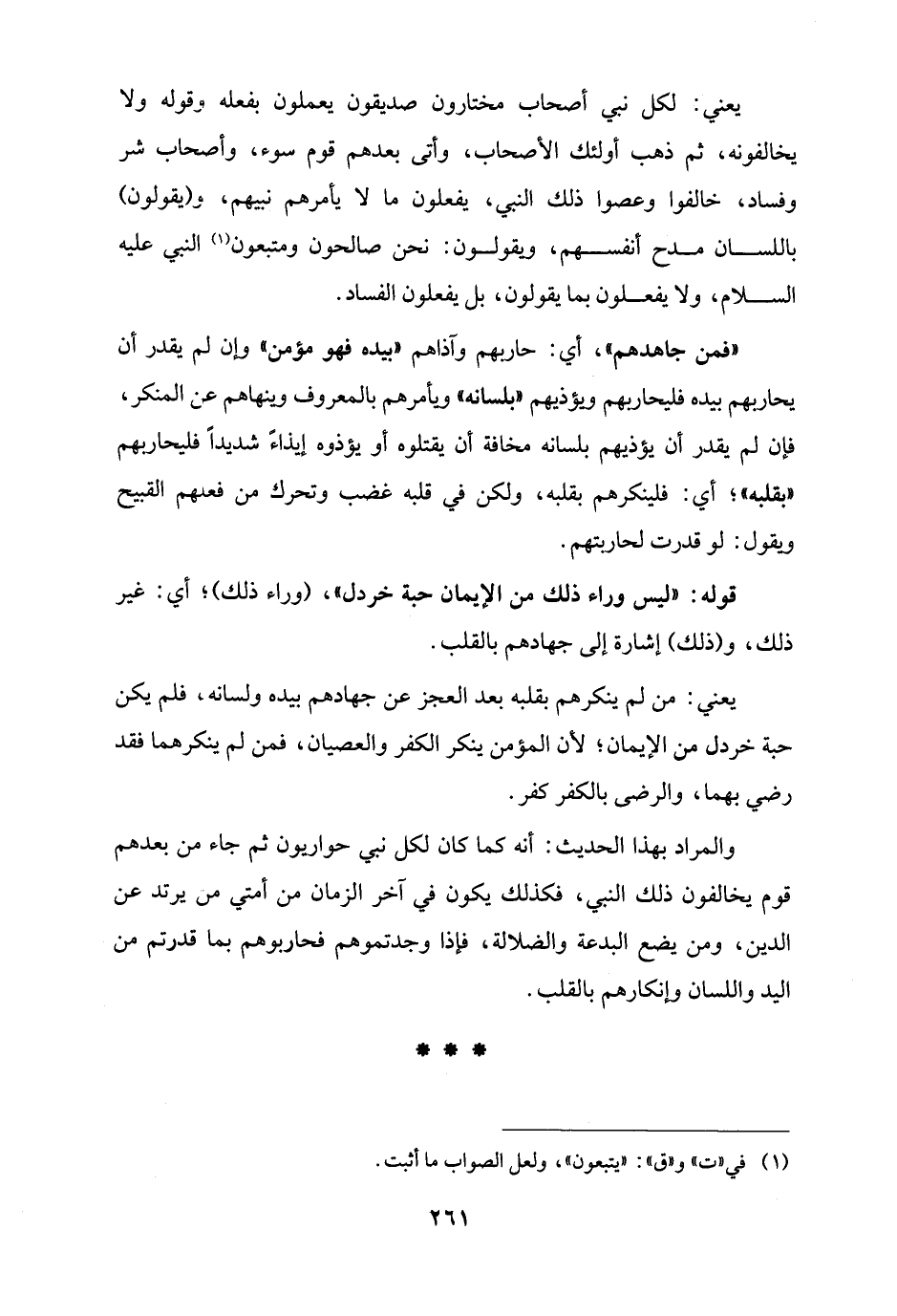"فمن جاهدهم"، أي: حاربهم وآذاهم "بيده فهو مؤمن" وإن لم يقدر أن يحاربهم بيده فليحاربهم ويؤذيهم "بلسانه" ويأمرهم بالمعروف وينهاهم عن المنكر، فإن لم يقدر أن يؤذيهم بلسانه مخافة أن يقتلوه أو يؤذوه إيذاءً شديدًا فليحاربهم "بقلبه"؛ أي: فلينكرهم بقلبه، ولكن في قلبه غضب وتحرك من فعلهم القبيح ويقول: لو قدرت لحاربتهم.