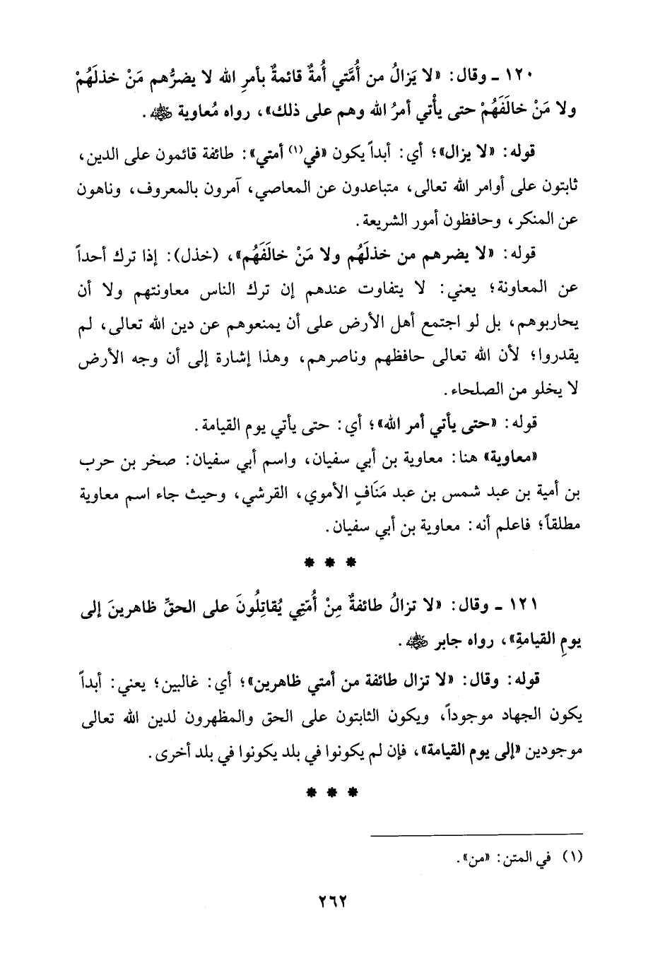 120 - وقال: "لا يَزالُ من أُمَّتي أُمةٌ قائمةٌ بأمرِ الله لا يضرُّهم مَنْ خذلَهُمْ ولا مَنْ خالَفَهُمْ حتى يأْتي أمرُ الله وهم على ذلك"، رواه مُعاوية - رضي الله عنه -.