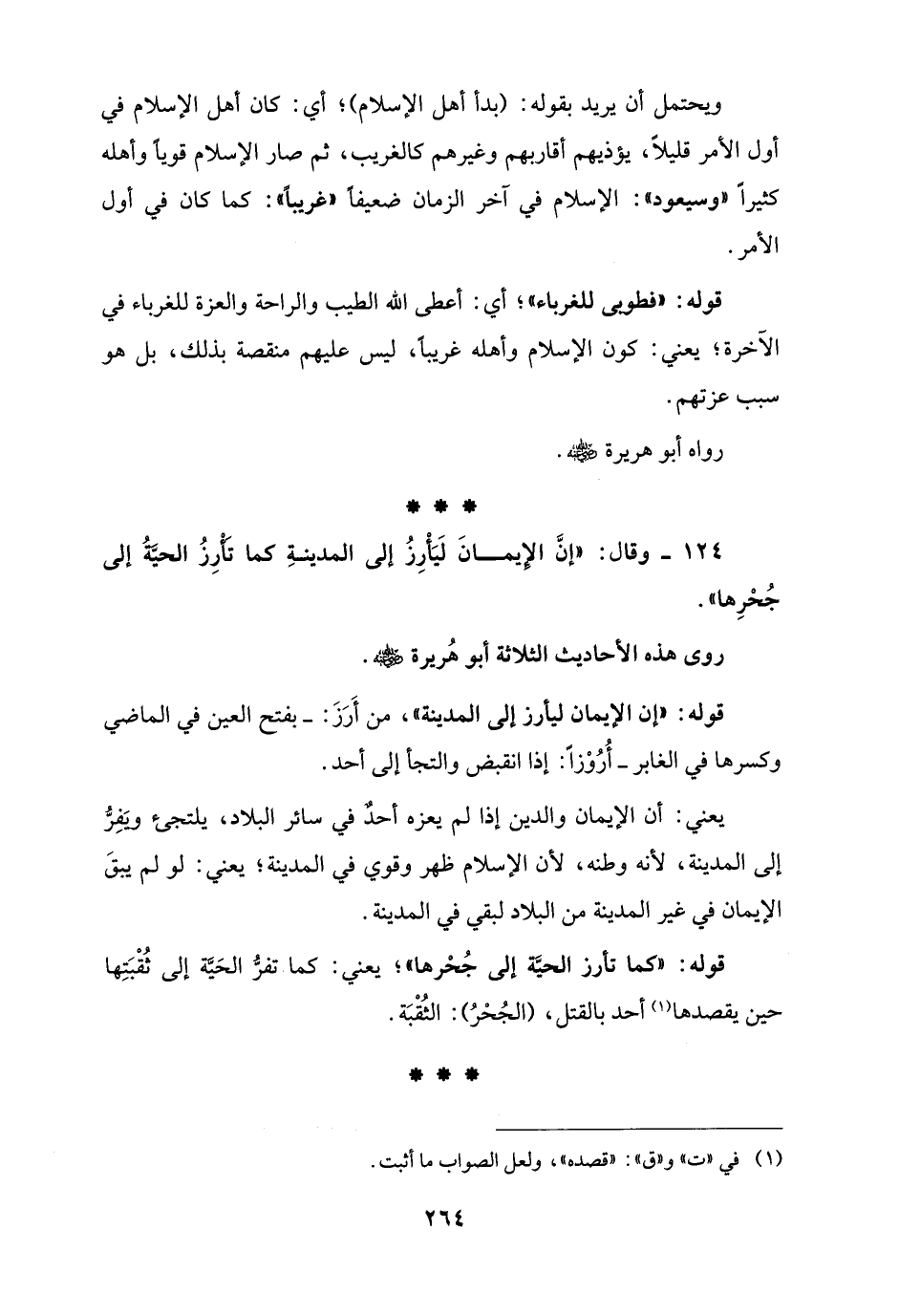 124 - وقال: "إنَّ الإِيمانَ لَيَأْرِزُ إلى المدينةِ كما تَأْرِزُ الحيَّةُ إلى جُحْرِها".