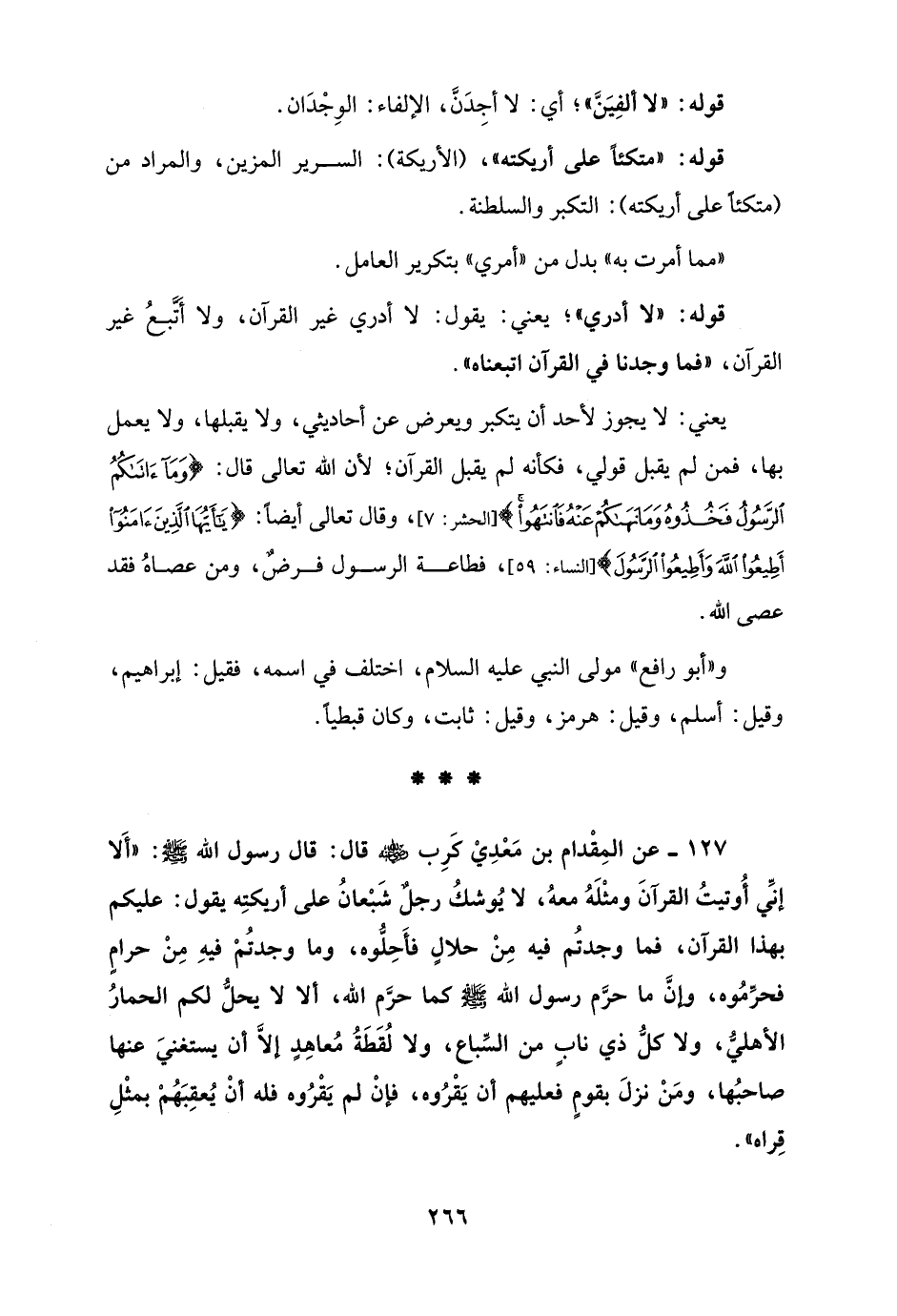 127 - عن المِقْدام بن مَعْدِيْ كَرِب - رضي الله عنه - قال: قال رسول الله - صلى الله عليه وسلم -: "أَلا إِنِّي أُوتيتُ القرآنَ ومثْلَهُ معهُ، لا يُوشكُ رجلٌ شَبْعانُ على أريكتِه يقول: عليكم بهذا القرآن، فما وجدتُم فيه مِنْ حلالٍ فأَحِلُّوه، وما وجدتُمْ فيهِ مِنْ حرامٍ فحرِّمُوه، وإنَّ ما حرَّم رسول الله - صلى الله عليه وسلم - كما حرَّم الله، ألا لا يحلُّ لكم الحمارُ الأهليُّ، ولا كلُّ ذي نابٍ من السِّباع، ولا لُقَطَةُ مُعاهِدٍ إلاَّ أن يستغنيَ عنها صاحبُها، ومَنْ نزلَ بقومٍ فعليهم أن يَقْرُوه، فإنْ لم يَقْرُوه فله أنْ يُعقِبَهُمْ بمثْلِ قِراه".