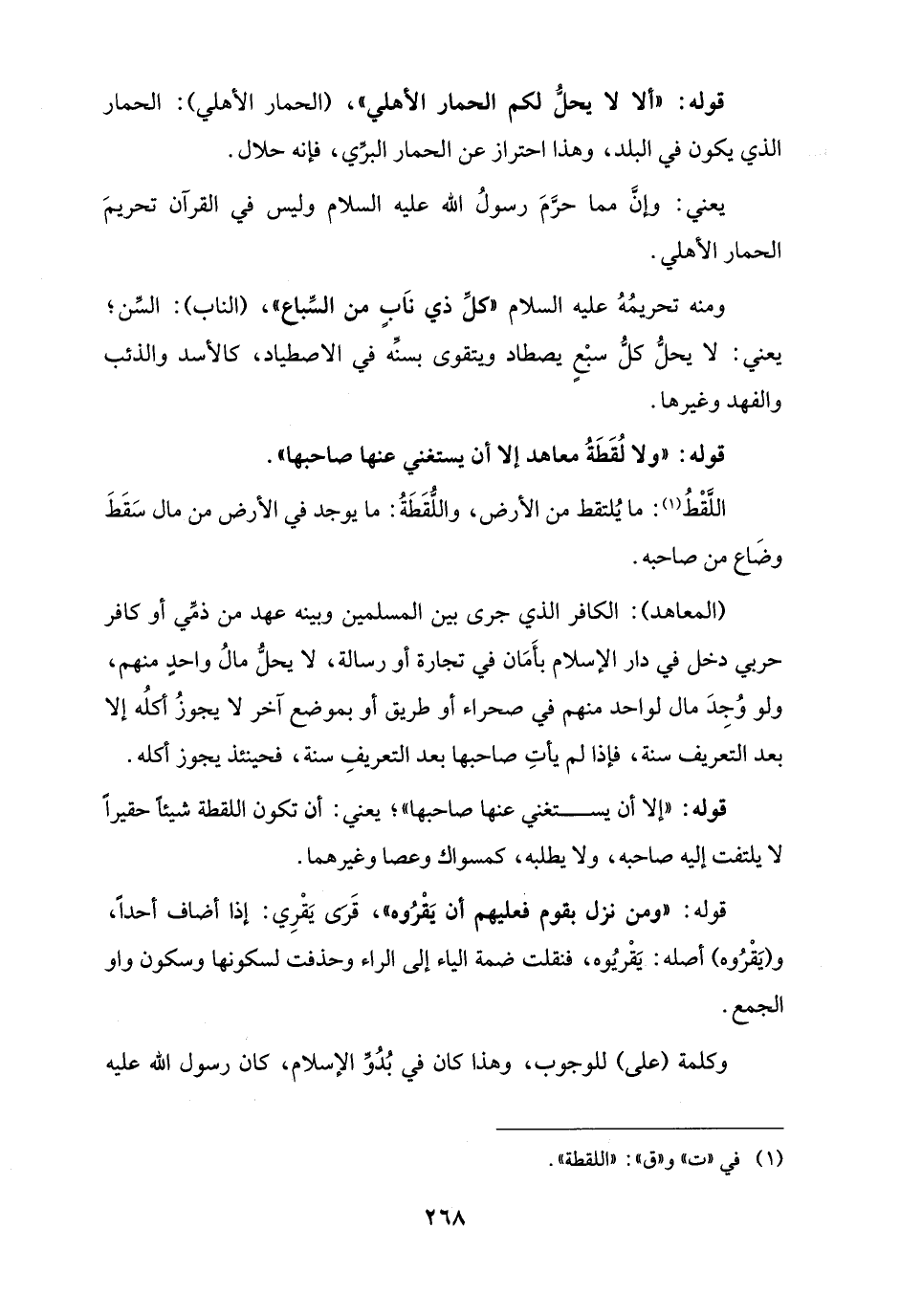 ومنه تحريمُهُ عليه السلام "كلِّ ذي نَابٍ من السِّباع"، (الناب): السِّن؛ يعني: لا يحلُّ كلُّ سبْعٍ يصطاد ويتقوى بسنِّه في الاصطياد، كالأسد والذئب والفهد وغيرها.