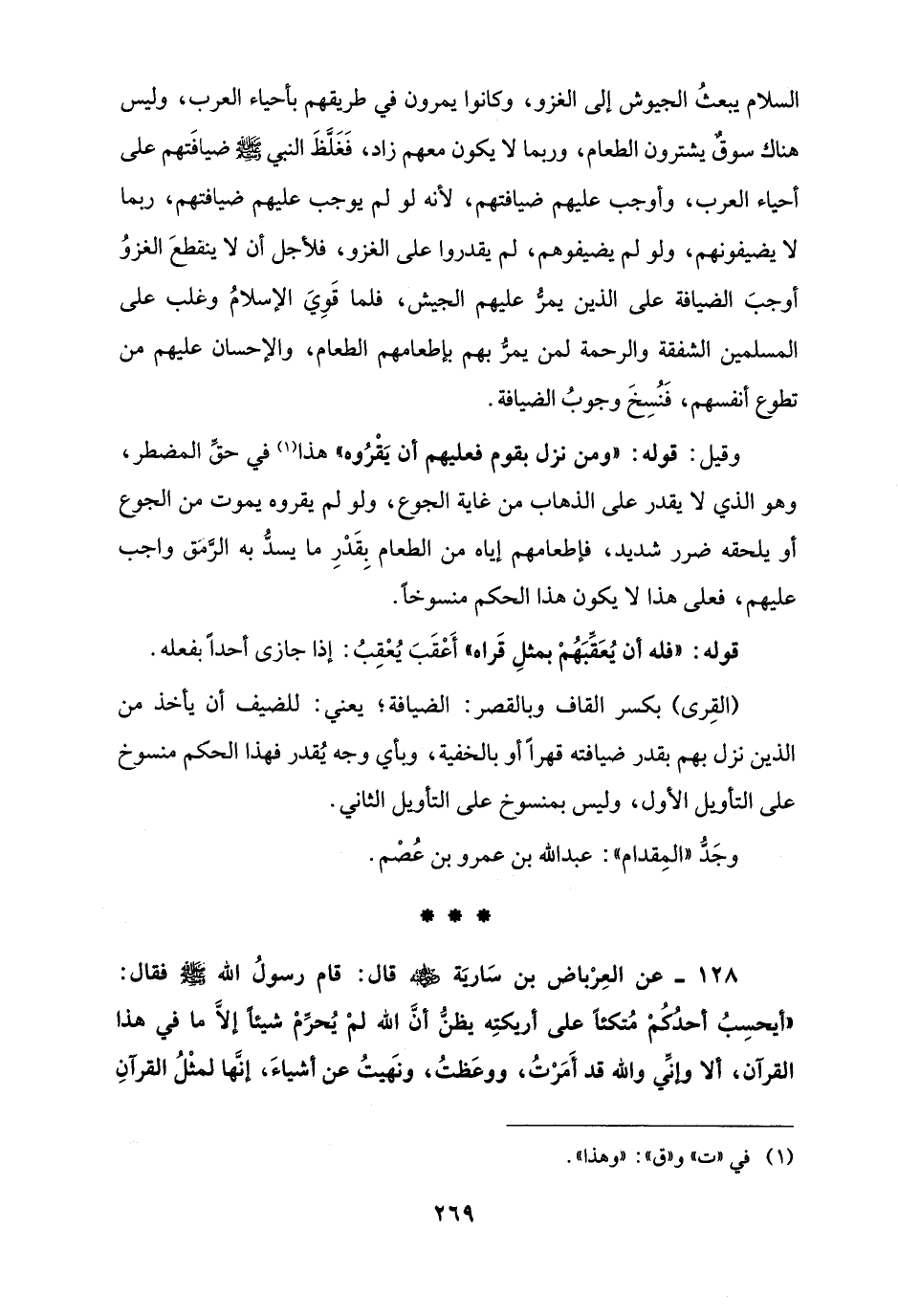 وقيل: قوله: "ومن نزل بقوم فعليهم أن يَقْرُوه" هذا (¬1) في حقِّ المضطر، وهو الذي لا يقدر على الذهاب من غاية الجوع، ولو لم يقروه يموت من الجوع أو يلحقه ضرر شديد، فإطعامهم إياه من الطعام بِقَدْرِ ما يسدُّ به الرَّمَق واجب عليهم، فعلى هذا لا يكون هذا الحكم منسوخًا.