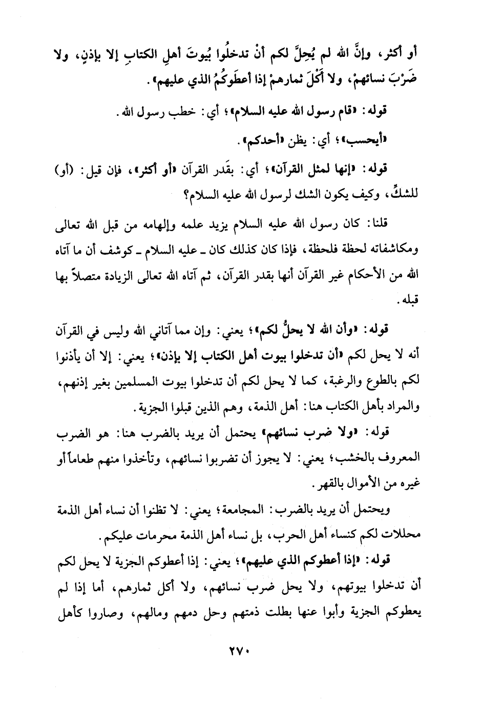 أو أكثر، وإنَّ الله لم يُحِلَّ لكم أنْ تدخلُوا بُيوتَ أهلِ الكتابِ إلا بإذنٍ، ولا ضَرْبَ نسائهمْ، ولا أَكْلَ ثمارهمْ إذا أعطَوكُمُ الذي عليهم".