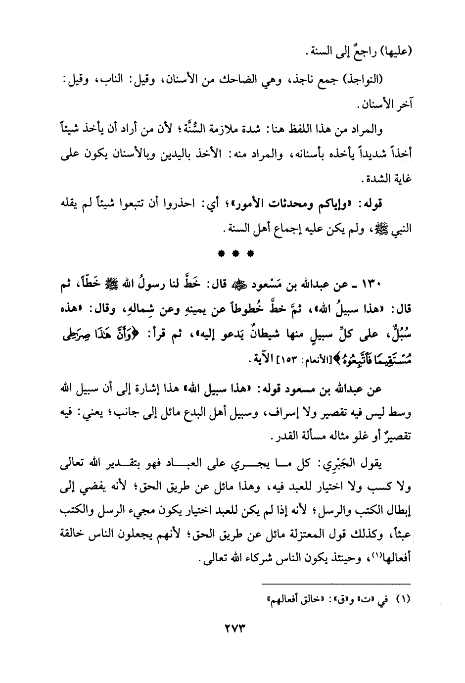 130 - عن عبد الله بن مَسْعود - رضي الله عنه - قال: خَطَّ لنا رسولُ الله - صلى الله عليه وسلم - خَطًّا، ثم قال: "هذا سبيلُ الله"، ثمَّ خطَّ خُطوطًا عن يمينهِ وعن شِمالهِ، وقال: "هذه سُبُلٌّ، على كلِّ سبيلٍ منها شيطانٌ يَدعو إليه"، ثم قرأ: {وَأَنَّ هَذَا صِرَاطِي مُسْتَقِيمًا فَاتَّبِعُوهُ} [الأنعام: 153] الآية.