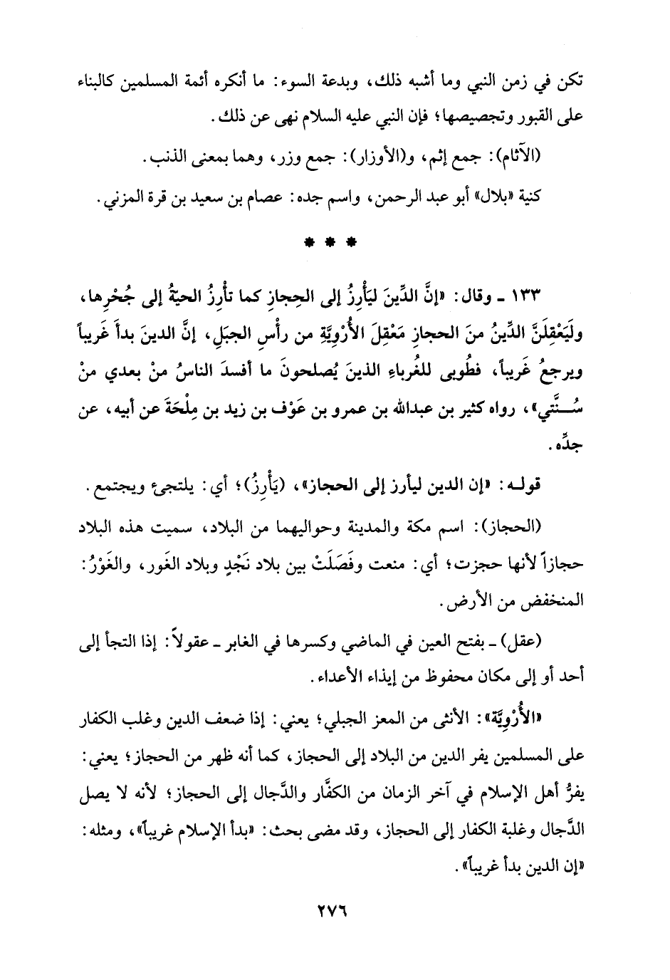 133 - وقال: "إنَّ الدِّينَ ليَأْرِزُ إلى الحِجازِ كما تأْرِزُ الحيّةُ إلى جُحْرِها، ولَيَعْقِلَنَّ الدِّينُ منَ الحجازِ مَعْقِلَ الأُرْوِّيةِ من رأْسِ الجبَلِ، إنَّ الدينَ بدأَ غَريبًا ويرجعُ غَريبًا، فطُوبى للغُرباءِ الذينَ يُصلحونَ ما أفسدَ الناسُ منْ بعدي منْ سُنَّتي"، رواه كثير بن عبد الله بن عمرو بن عَوْف بن زيد بن مِلْحَةَ عن أبيه، عن جدِّه.