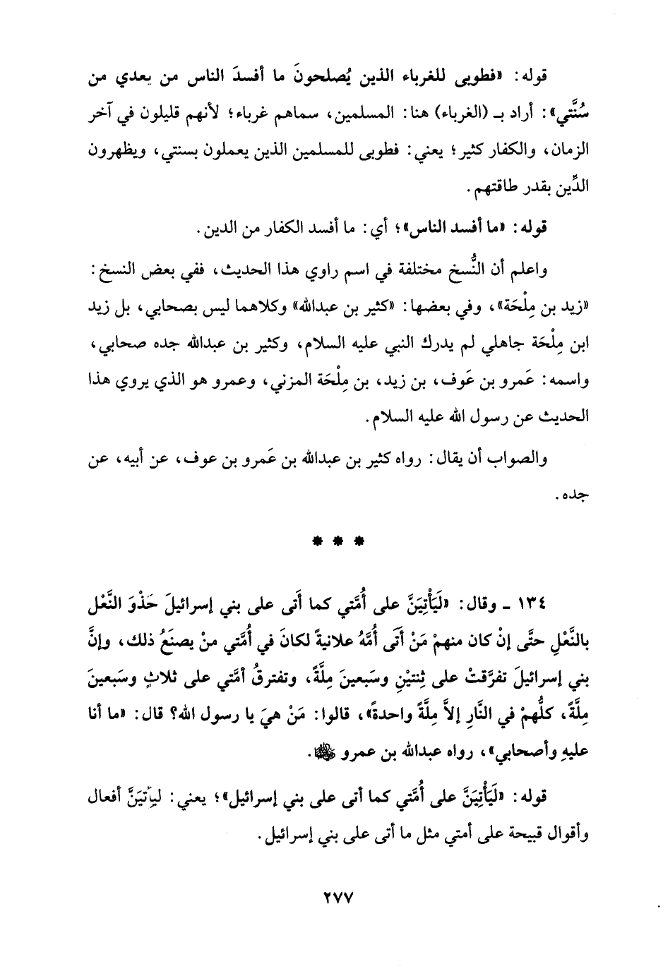 134 - وقال: "لَيَأْتِيَنَّ على أُمَّتي كما أَتى على بني إسرائيلَ حَذْوَ النَّعْل بالنَّعْلِ حتَّى إنْ كان منهمْ مَنْ أتَى أُمَّهُ علانيةً لكانَ في أُمَّتي منْ يصنَعُ ذلك، وإنَّ بني إسرائيلَ تفرَّقتْ على ثِنتيْنِ وسَبعينَ مِلَّةً، وتفترقُ أمَّتي على ثلاثٍ وسَبعينَ مِلَّةً، كلُّهمْ في النَّارِ إلاَّ مِلَّةً واحدةً"، قالوا: مَنْ هيَ يا رسول الله؟ قال: "ما أنا عليهِ وأصحابي"، رواه عبد الله بن عمرو - رضي الله عنهما -.