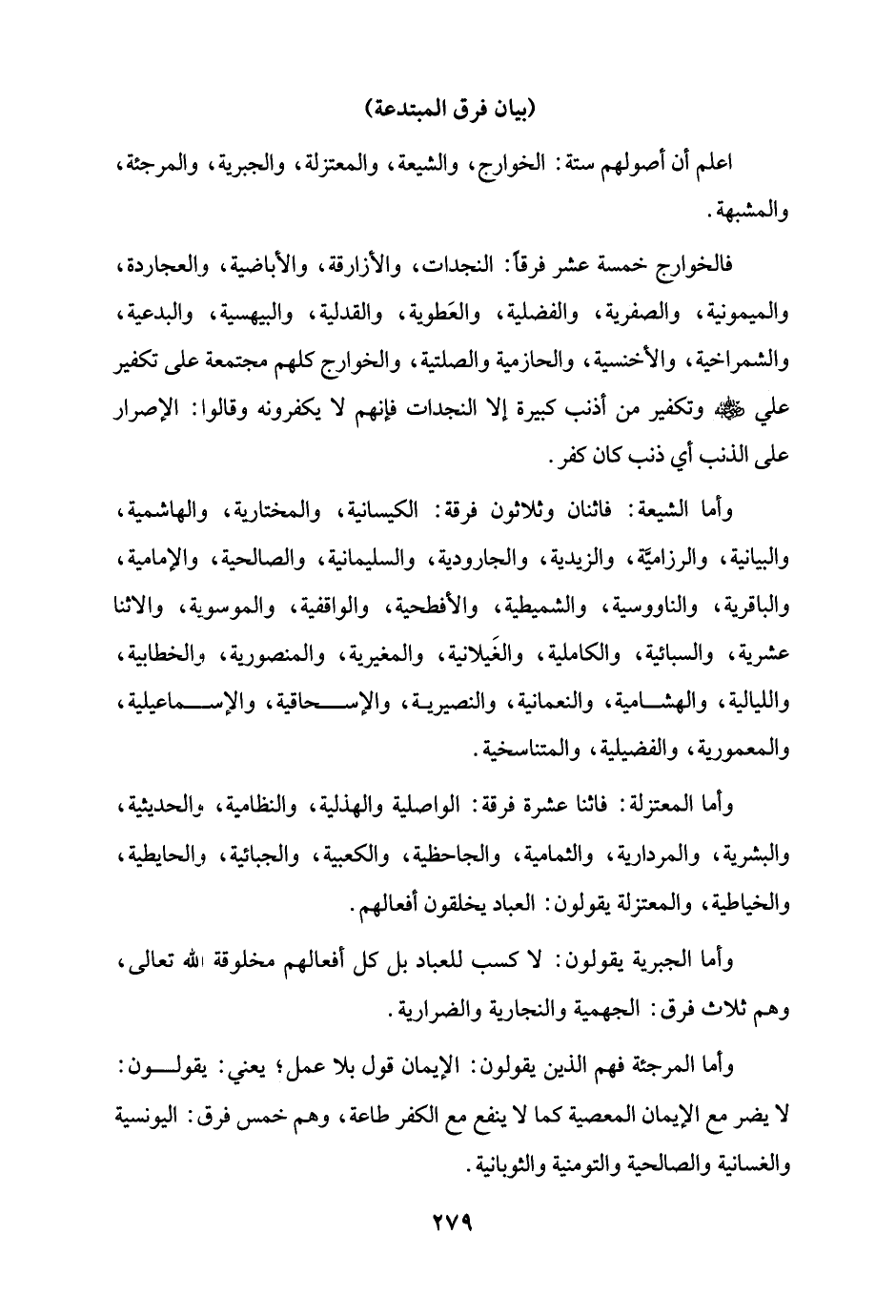 اعلم أن أصولهم ستة: الخوارج، والشيعة، والمعتزلة، والجبرية، والمرجئة، والمشبهة.