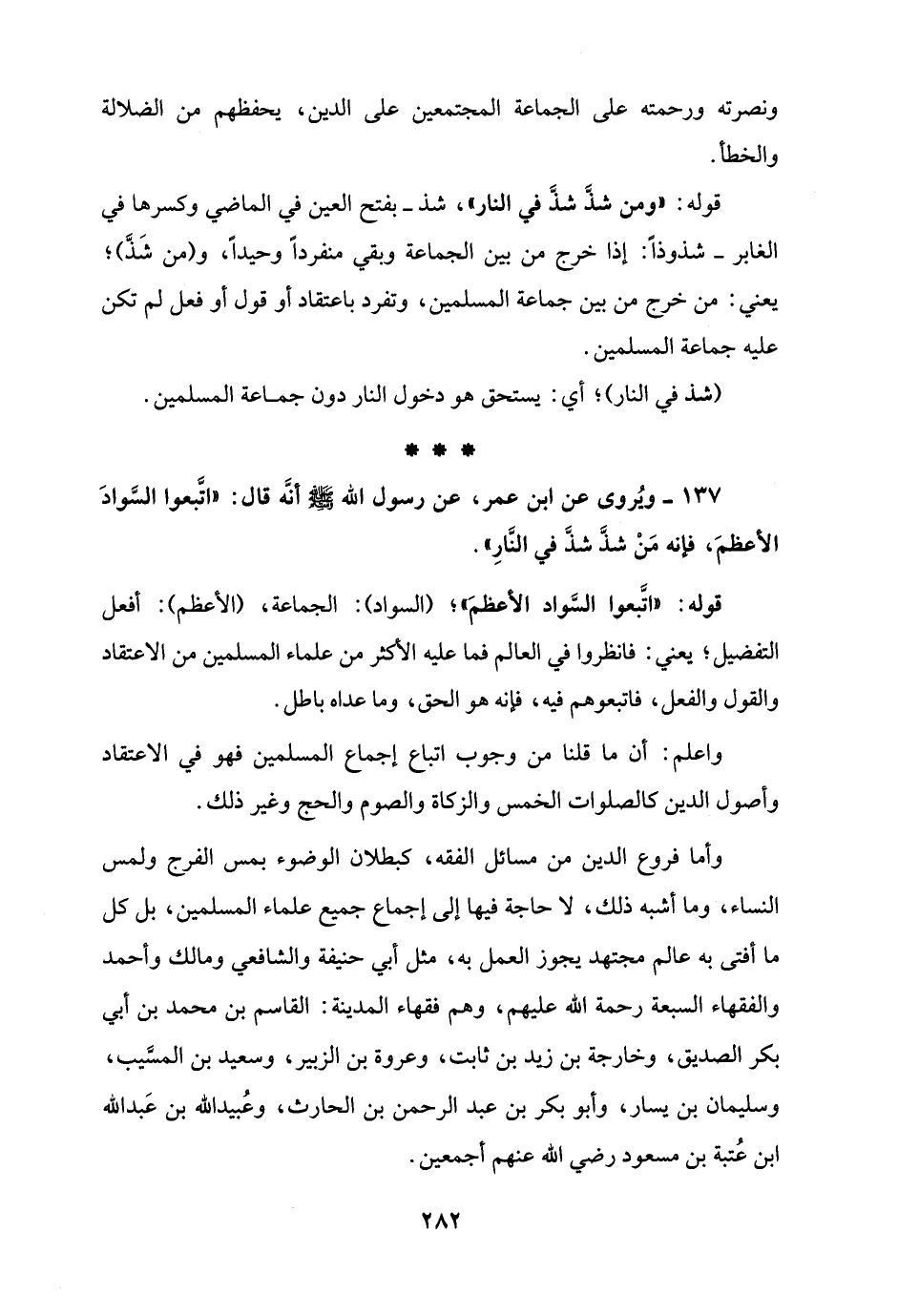 137 - ويُروى عن ابن عمر، عن رسول الله - صلى الله عليه وسلم - أنَّه قال: "اتَّبعوا السَّوادَ الأعظمَ، فإنه مَنْ شذَّ شذَّ في النَّارِ".