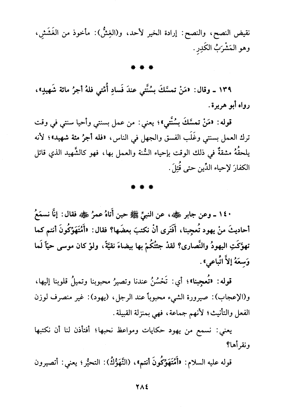 140 - وعن جابر - رضي الله عنه -، عن النبيِّ - صلى الله عليه وسلم - حين أَتاهُ عمرُ - رضي الله عنه - فقال: إنَّا نسمَعُ أحاديثَ منْ يهود تُعجِبنا، أَفَتَرى أنْ نكتبَ بعضَها؟ فقال: "أَمُتَهَوِّكُونَ أنتم كما تهوَّكَتِ اليهودُ والنَّصارى؟ لقدْ جئتُكُمْ بها بيضاءَ نقيَّةً، ولوْ كان موسى حيًّا لَما وَسِعَهُ إلاَّ اتِّباعي".