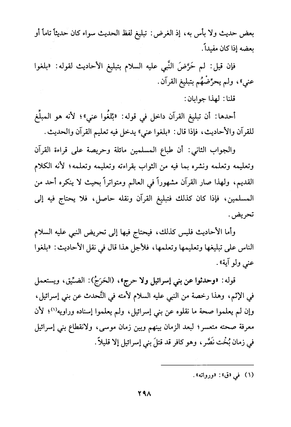 فإن قيل: لم حَرَّضَ النَّبي عليه السلام بتبليغ الأحاديث لقوله: "بلغوا عني"، ولم يحرِّضْهُم بتبليغ القرآن.