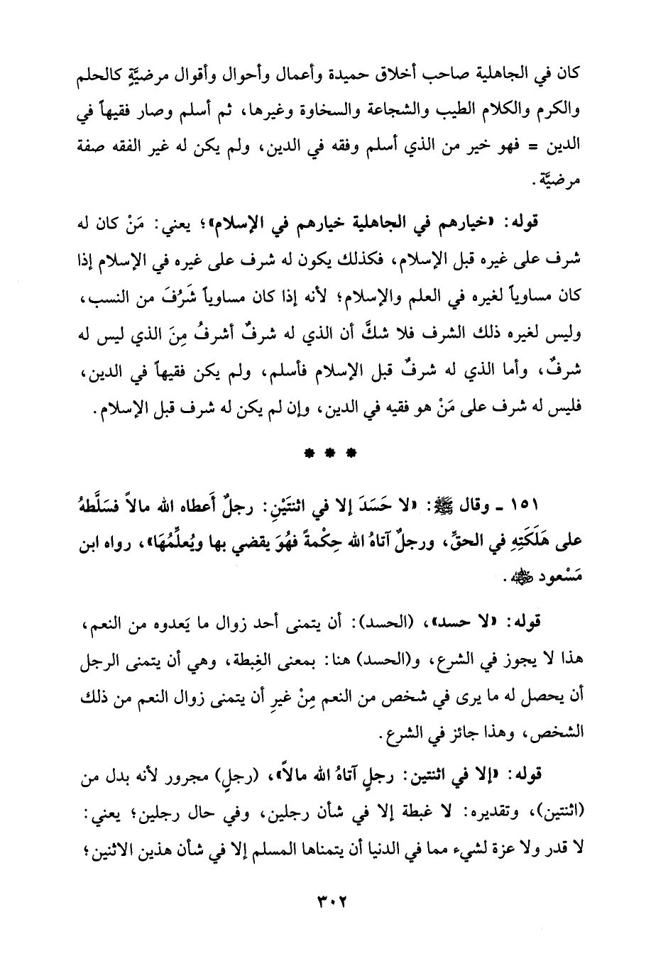 151 - وقال - صلى الله عليه وسلم -: "لا حَسَدَ إلا في اثنتَيْنِ: رجلٌ أَعطاه الله مالًا فسَلَّطهُ على هَلَكَتِهِ في الحقِّ، ورجلٌ آتاهُ الله حِكْمةً فهُوَ يقضي بها ويُعلِّمُهَا"، رواه ابن مَسْعود - رضي الله عنه -.