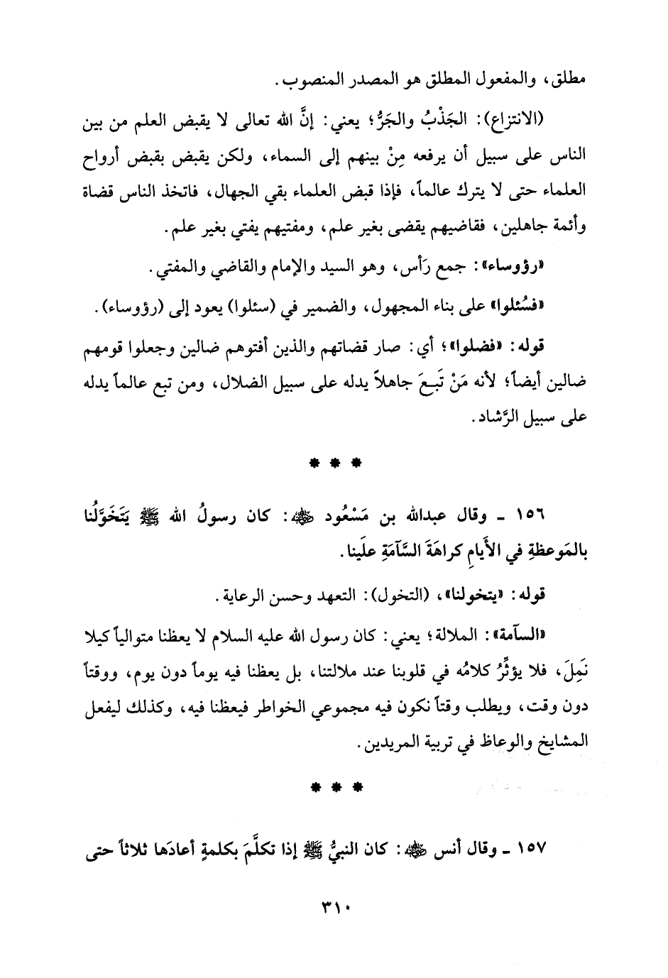 156 - وقال عبد الله بن مَسْعُود - رضي الله عنه -: كان رسولُ الله - صلى الله عليه وسلم - يتخَوَّلُنا بالمَوعظةِ في الأَيامِ كراهَةَ السَّآمَةِ علَينا.