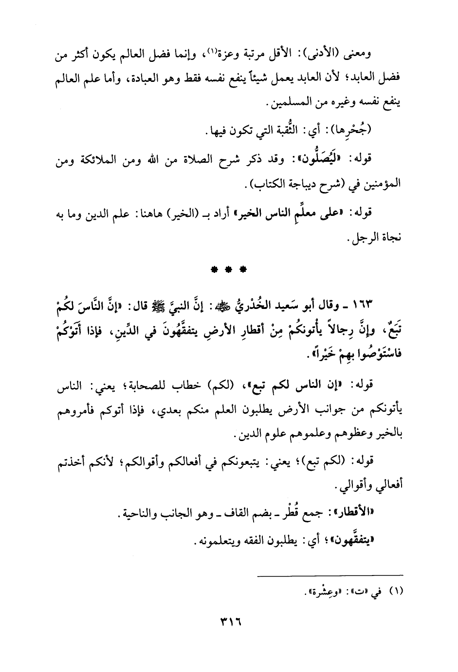 163 - وقال أبو سَعيد الخُدْريُّ - رضي الله عنه -: إنَّ النبيَّ - صلى الله عليه وسلم - قال: "إنَّ النَّاسَ لكُمْ تَبَعٌ، وإنَّ رِجالًا يأْتونكُمْ مِنْ أقطارِ الأرضِ يتفقَّهُونَ في الدِّينِ، فإذا أَتَوْكُمْ فاسْتَوْصُوا بهِمْ خَيْرًا".