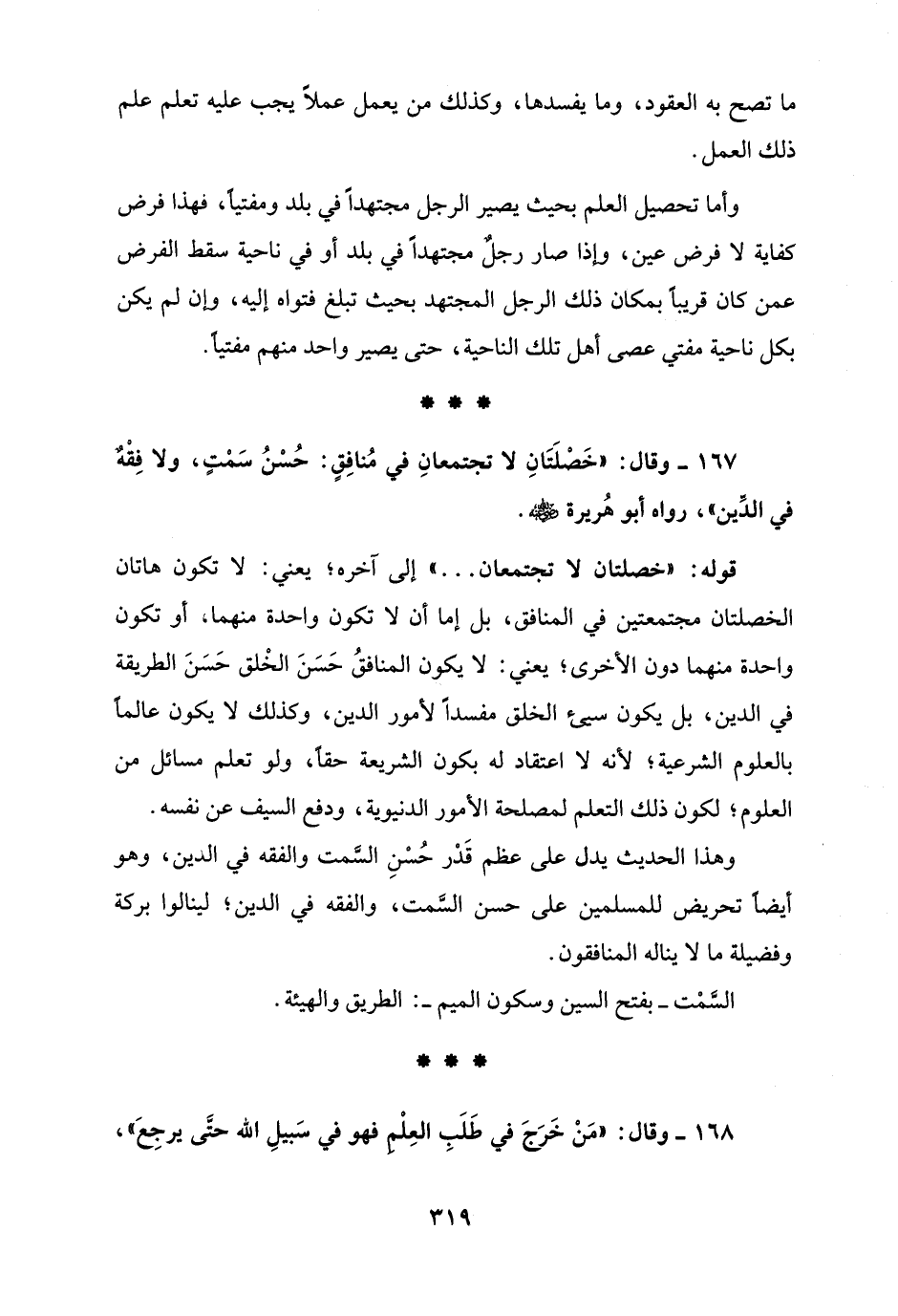167 - وقال: "خَصْلَتَانِ لا تجتمعانِ في مُنافِقٍ: حُسْنُ سَمْتٍ، ولا فِقْهٌ في الدِّين"، رواه أبو هُريرة - رضي الله عنه -.