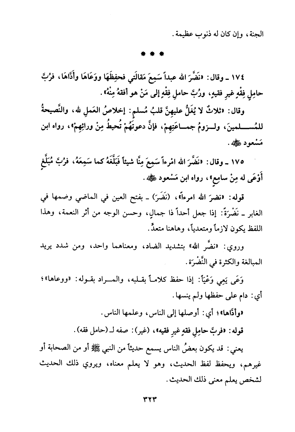 174 - وقال: "نَضَّرَ الله عبدًا سَمِعَ مَقالَتي فحفِظَهَا ووَعَاهَا وأَدَّاهَا، فرُبَّ حامِلٍ فِقْهٍ غيرِ فقيهٍ، ورُبَّ حاملِ فِقْهٍ إلى مَنْ هو أفقهُ مِنْهُ".