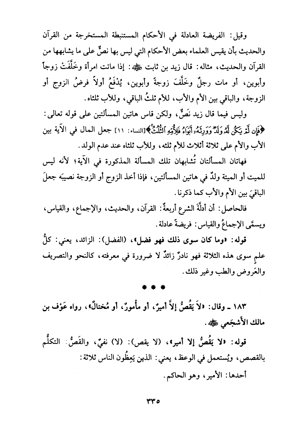 وقيل: الفريضة العادلة في الأحكام المستنبطة المستخرجة من القرآن والحديث بأن يقيس العلماء بعض الأحكام التي ليس بها نصٌّ على ما يشابهها من القرآن والحديث، مثاله: قال زيد بن ثابت - رضي الله عنه -: إذا ماتت امرأة وخَلَّفَتْ زوجًا وأبوين، أو مات رجل وخَلَّفَ زوجةً وأبوين، يُدْفَعُ أولًا فرضُ الزوج أو الزوجة، والباقي بين الأم والأب، للأم ثلثُ الباقي، وللأب ثلثاه.