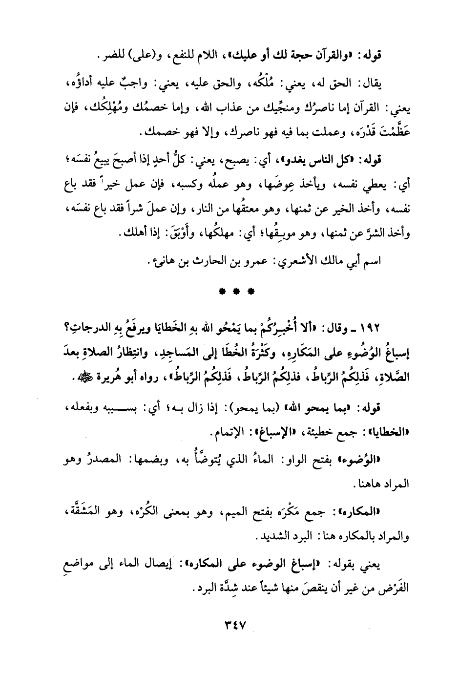 192 - وقال: "ألا أُخْبِرُكُمْ بما يَمْحُو الله بهِ الخَطايَا ويرفَعُ بِهِ الدرجاتِ؟ إسباغُ الوُضُوءِ على المَكَارِهِ، وكَثْرَةُ الخُطَا إلى المَساجِدِ، وانتِظارُ الصلاةِ بعدَ الصَّلاةِ، فَذلِكُمُ الرِّباطُ، فذلِكُمُ الرِّباطُ، فَذلِكُمُ الرِّباطُ"، رواه أبو هُريرة - رضي الله عنه -.